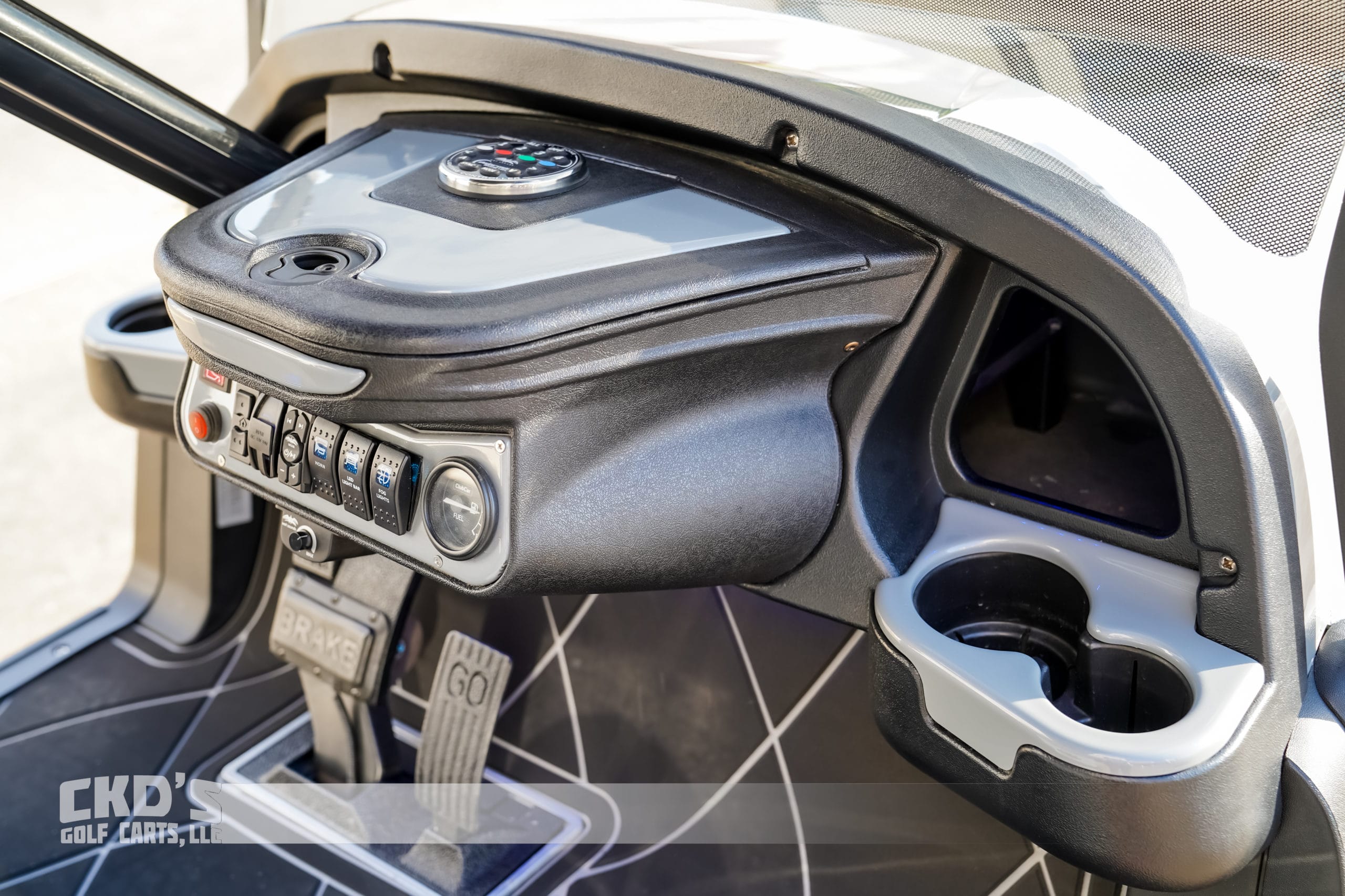 Selling on consignment a custom 2018 Club Car Alpha Body EFI 6 passenger Limo golf cart. This cart was custom built by one of our employees as a demo CKD’S golf cart. No expense was spared on this build! We took a 2018 Club Car EFI gas golf cart, stretched it, added a Allsports 8″ long travel lift kit, heavy duty rear leaf springs, 15″ M21 Lok wheels with 28″ EFX MotoClaw tires, wheel spacers and spacer adapters, custom drop down style nerf bars, custom MadJax Alpha Armor brush guard with body color matched trim pieces, Warn electric winch and Plashlights 6″ RGB back-lit LED light Bar, USA made Max 5 rear flip seat with swivel cup holders, built-in Plashlights reverse LED lights and SMV sign, Sentry Dash with garage door opener, Wetsounds Bluetooth Dongle, (2) sets of Wetsounds Revo 6 speakers with RGB rings, (1) set of Wetsounds Revo 8 speakers with RGB rings, Wetsounds HTX-6 amplifiers, dual USB outlets, accessory switches for LED light bars, Wetsounds 4 zone RGB controller, gas gauge and switch for a train horn! The cart has a custom Dek-It floor mat, tinted folding windshield, custom double diamond stitched upholstery, an extremely loud train horn (to make people move out of your way or to scare your neighbors!), huge AGM battery to run the cart and all of the accessories, second row cup-holders, high torque clutch spring, 30″ Plashlights RGB back-light LED light bar, custom steering wheel and body color matched adapter, 5 panel mirror and side view mirrors.