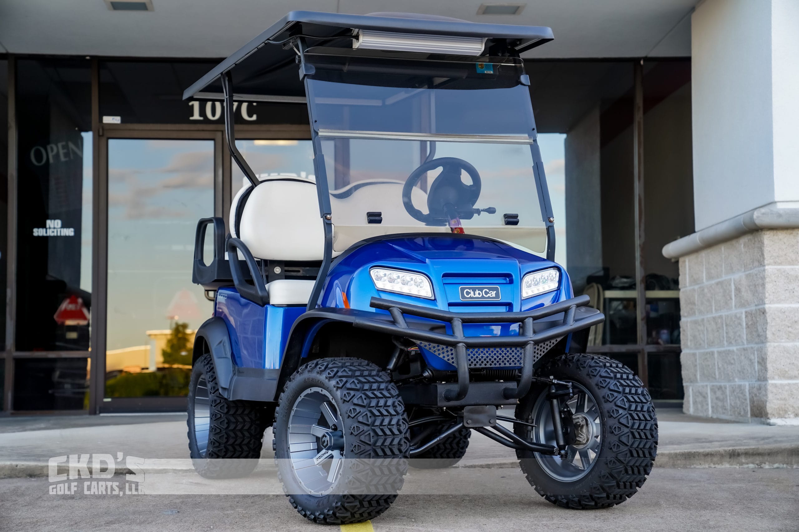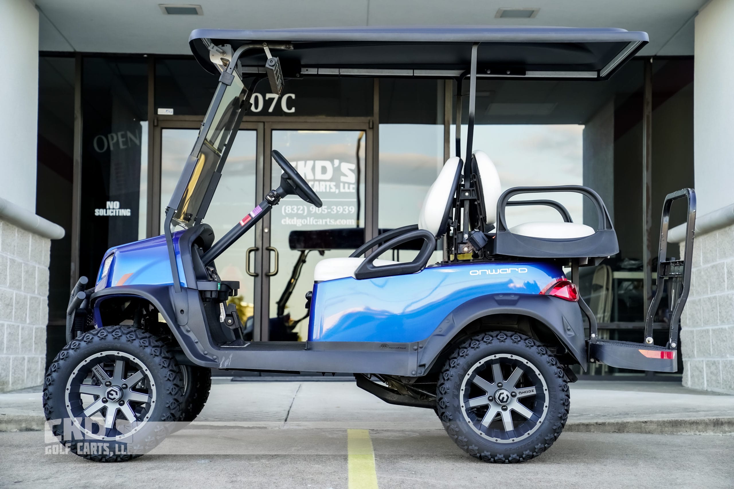 Selling on consignment a 2018 Club Car Onward EFI Gas lifted golf cart in Lightning Blue with a fresh service, Subaru efi gas 14 hp engine, new 14″ MODZ Assault Gun Metal Grey 14″ wheels with 23″ Arisun tires, black 80″ extended top with built in weather enclosure track, white upholstery, dual USB ports, Max 5 rear flip seat (can add hidden cooler bucket/storage bin), factory windshield, 5 panel mirror, factory brush guard, Wetsounds Stealth 6 Bluetooth soundbar, Ultimate LED light kit (includes headlights, taillights, brake lights, emergency flashers and horn), factory fuel gauge and SMV sign. This cart is nice and is priced thousands less than a new one!