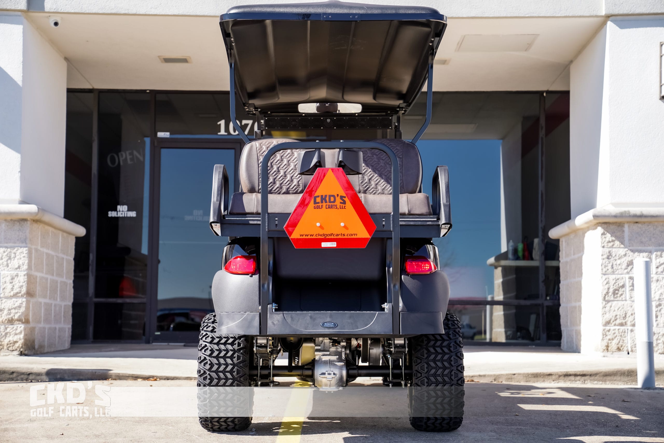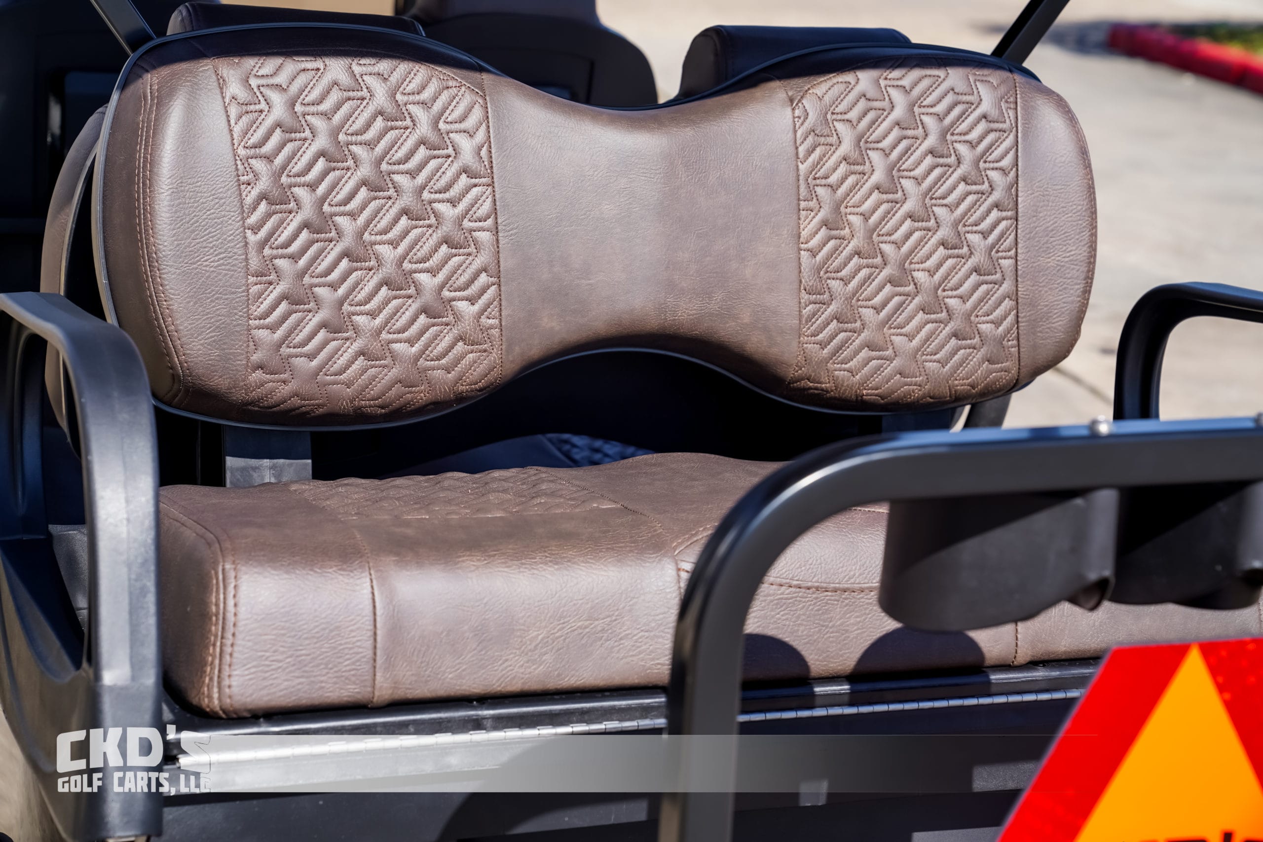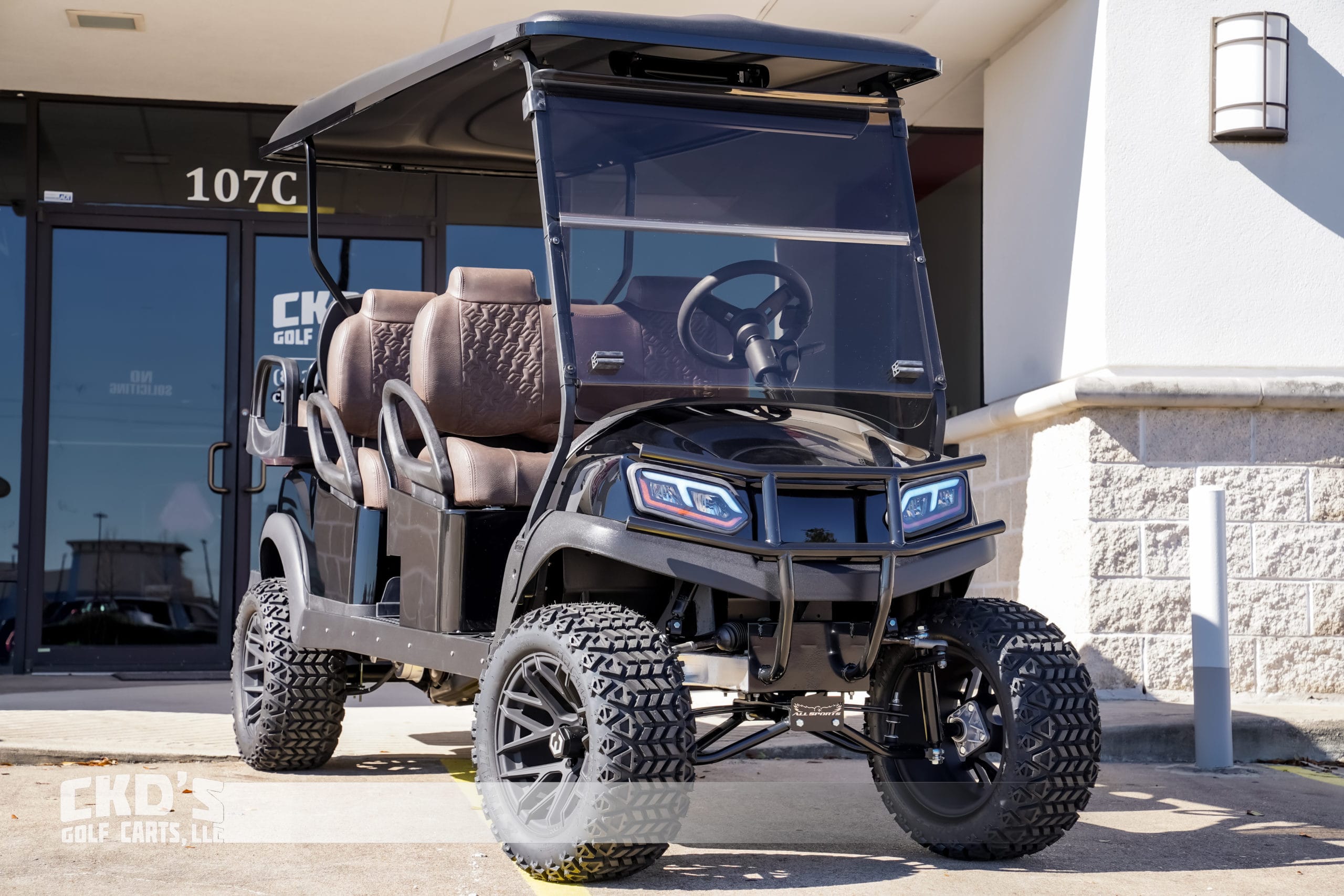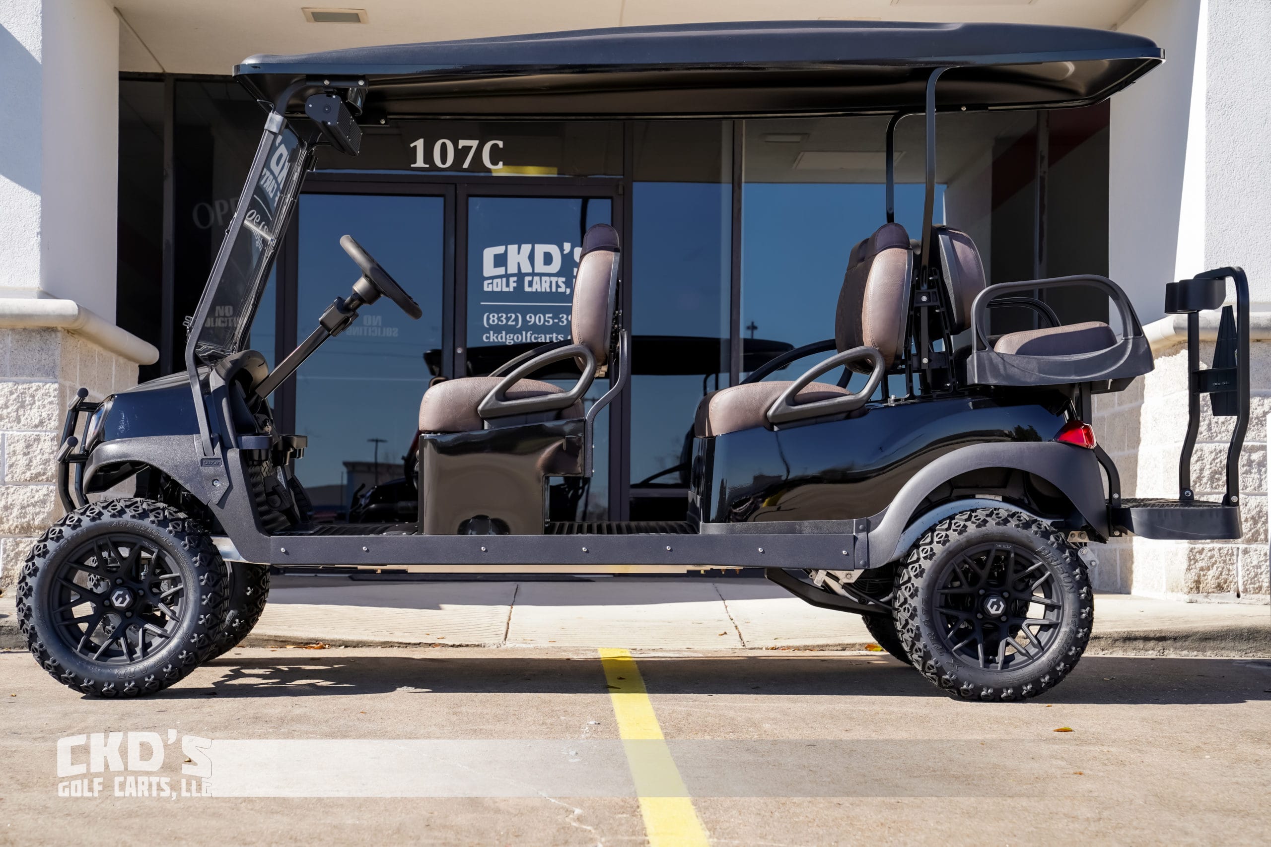 We have custom-built this fine-looking machine with a like-new 2019 Club Car Tempo golf cart and we used the best of the best on this cart! The cart has also had our fresh full reconditioning service. We’ve done a new 6-seater “stretch” conversion and installed the following accessories: custom painted tough-looking Jet Black Tempo bodies with custom front heavy-duty Tempo brush guard (in which we can install a off-road style LED light, front color-matched painted seat pod with under-seat storage area, 112″ black extended top with a track that we can install built-in RGB LED accent lighting and under the cart (change it to any color you’d like with an app on your phone), 6″ All Sports heavy-duty USA-made MEGA A-Arm lift (for longevity and the smoothest ride!), heavy-duty rear leaf springs, 14″ MODZ Matrix Matte Black Wheels with 23×10-14 Arisun Tires, custom MadJax Executive Leather style custom seats, USA-made black Max 5 rear flip seat with stainless hardware, swivel cup-holders, hidden storage compartment/ice chest and black plastic (rust free) footpan. Custom-cut heavy black diamond plate rubber style non-skid floor mat, tinted folding “non-squeak” windshield, overhead rear view mirror, Tempo Ultimate LED light kit (includes LED headlights, LED taillights and LED brake lights, tum signals, emergency flashers, daytime running lights and a horn), SMV sign and a Wetsounds Stealth 10 Ultra Bluetooth Soundbar (can install a trunk mounted Wetsounds AS-10 10″ powered subwoofer to give you some bump in your trunk!) This stereo system sounds awesome!