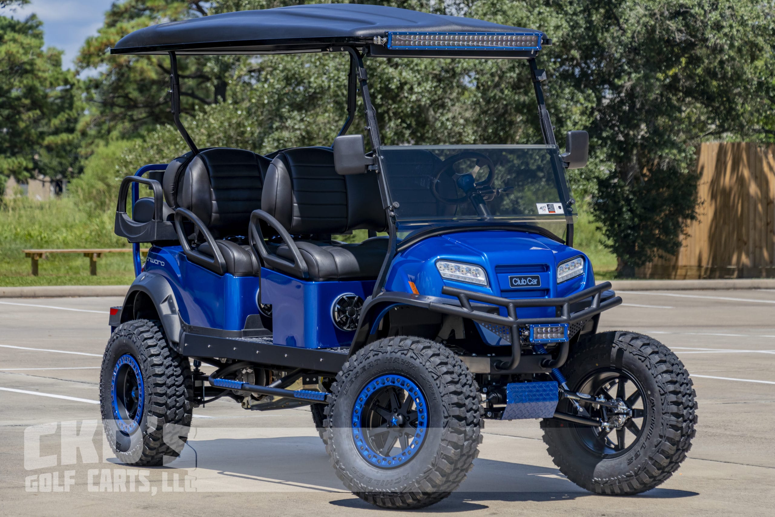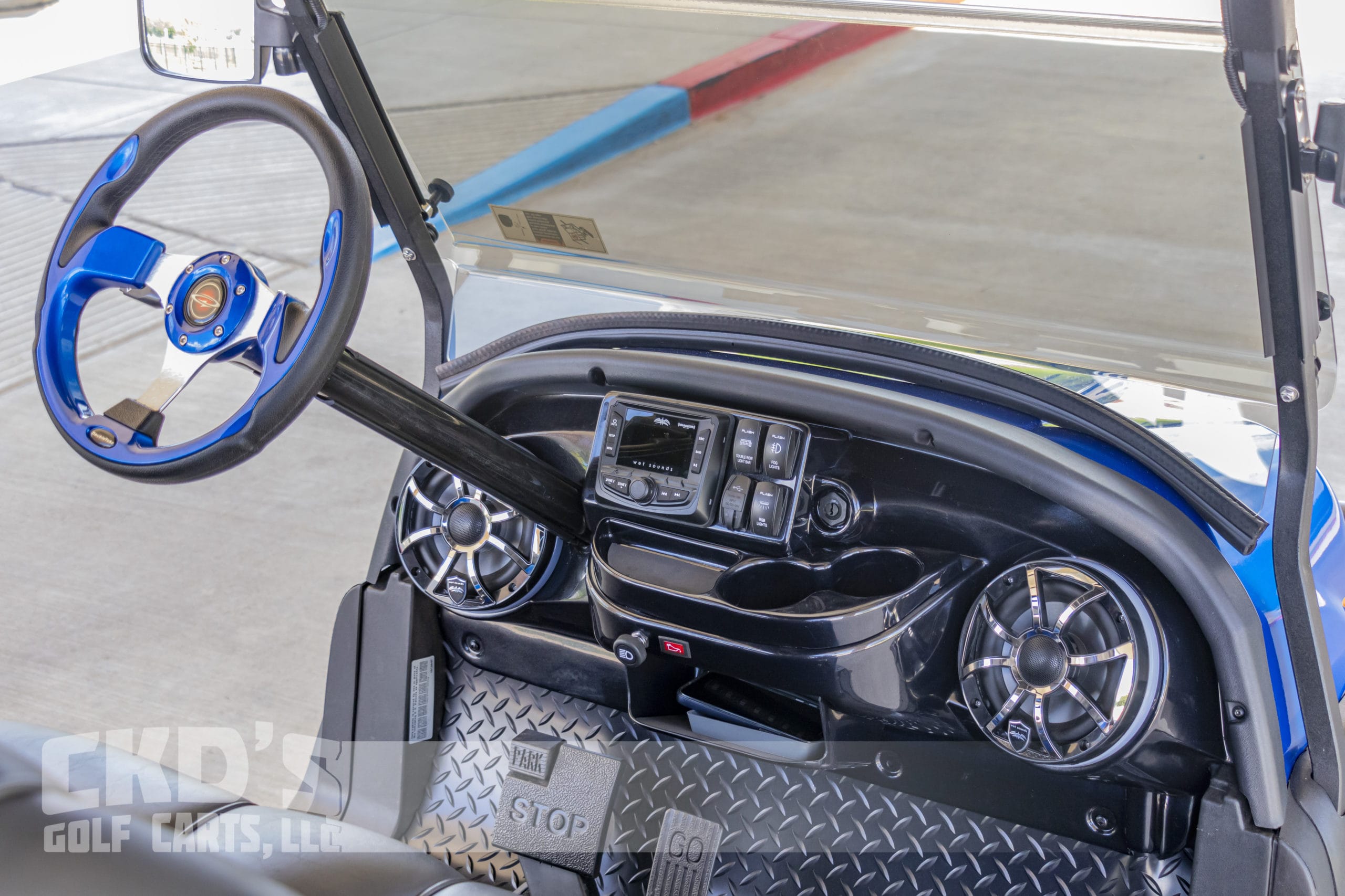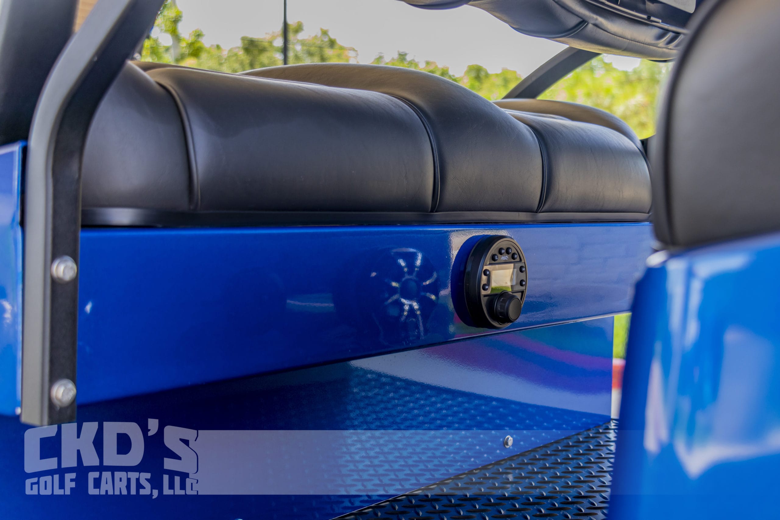 Custom-built 2019 Club Car Onward 6-passenger stretched “Monster” EFI gas-powered ‘limo’ golf cart! We have custom-built this fine-looking machine using a like new 2019 Club Car Onward golf cart with the newest Subaru 14 HP EFI gas engine and we’ve used the best of the best on this cart! The cart has had our fresh full reconditioning service and the engine has been serviced as well! We’ve done a new 6-seater “stretch” conversion and installed the following accessories: the exciting tough-looking and unique Onward bodies that we custom-painted in Lightning Blue and installed an 11″ new style heavy duty USA-made All Sports Long Travel lift with front nitrogen shocks (for the smoothest ride!), Heavy-duty rear leaf springs, newest style 15″ MSA M31 LOK II wheels with huge 30″ Desert Hawk radial tires, custom black powder-coated nerf bars with color-matched diamond plate steps, custom black Club Car Premium seats that are super comfortable and super stylish, front heavy-duty brush guard with 6” RGB Backlit LED light bar, Front color-matched seat pod with under-seat storage area, 112″ black extended top with built-in RGB LED accent lighting (change it to any color you’d like with an app on your phone.) This cart also features our new fold-down top system so you can fit it in your toy hauler or even your standard garage!