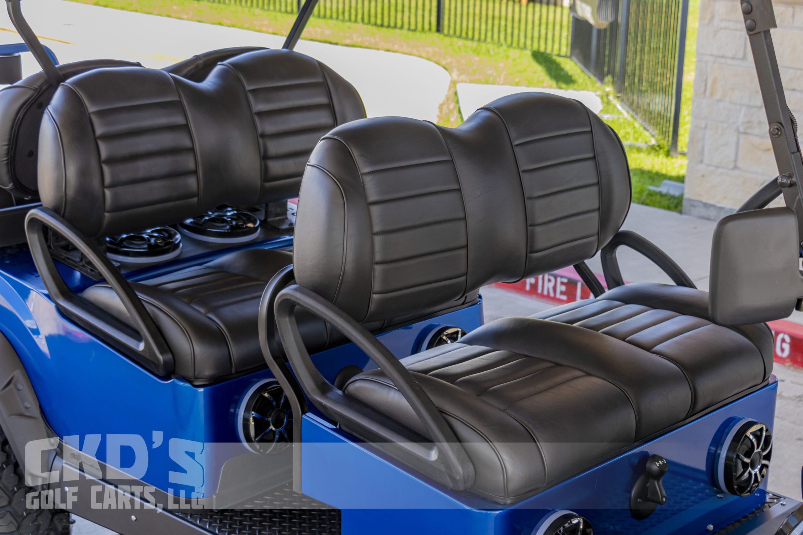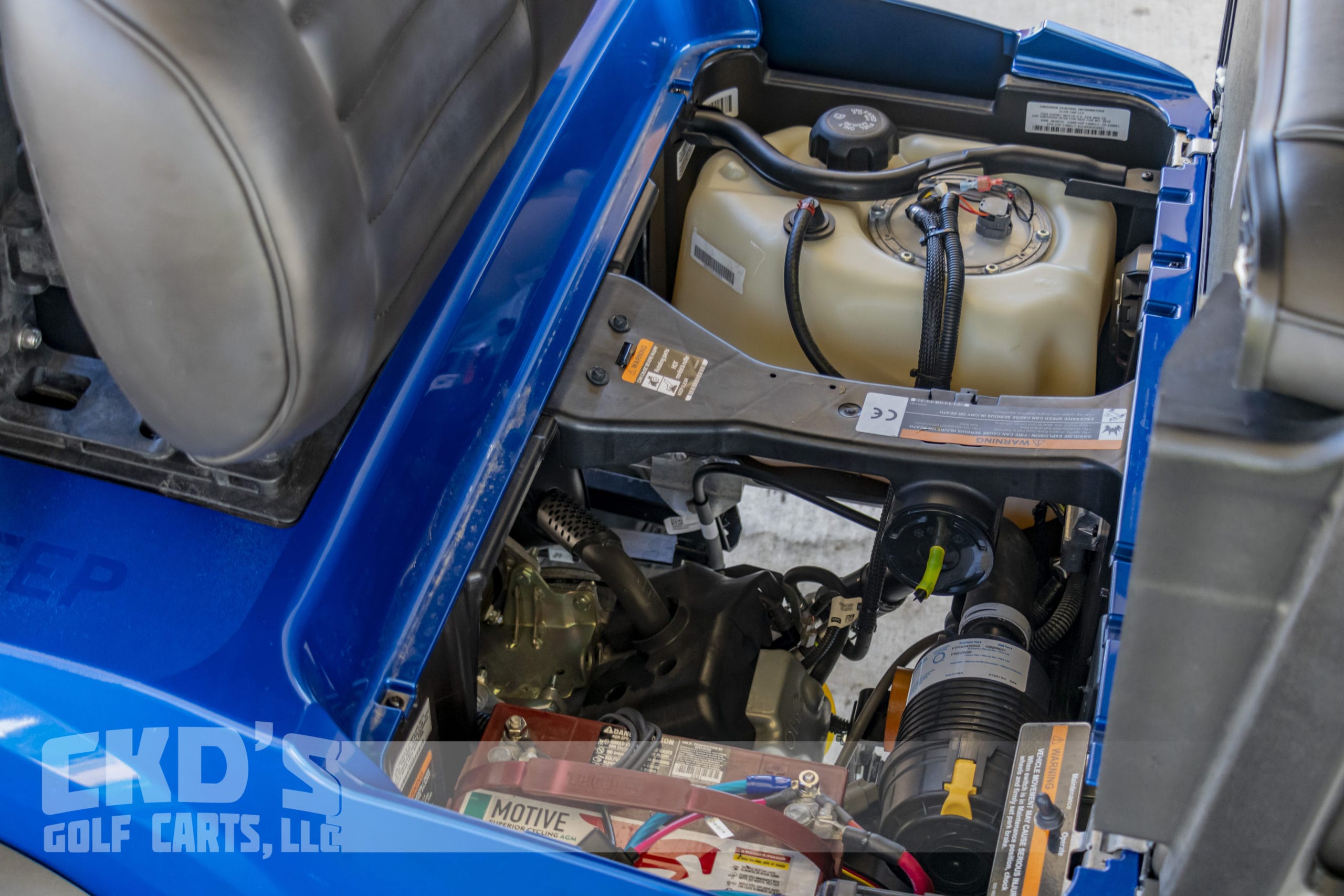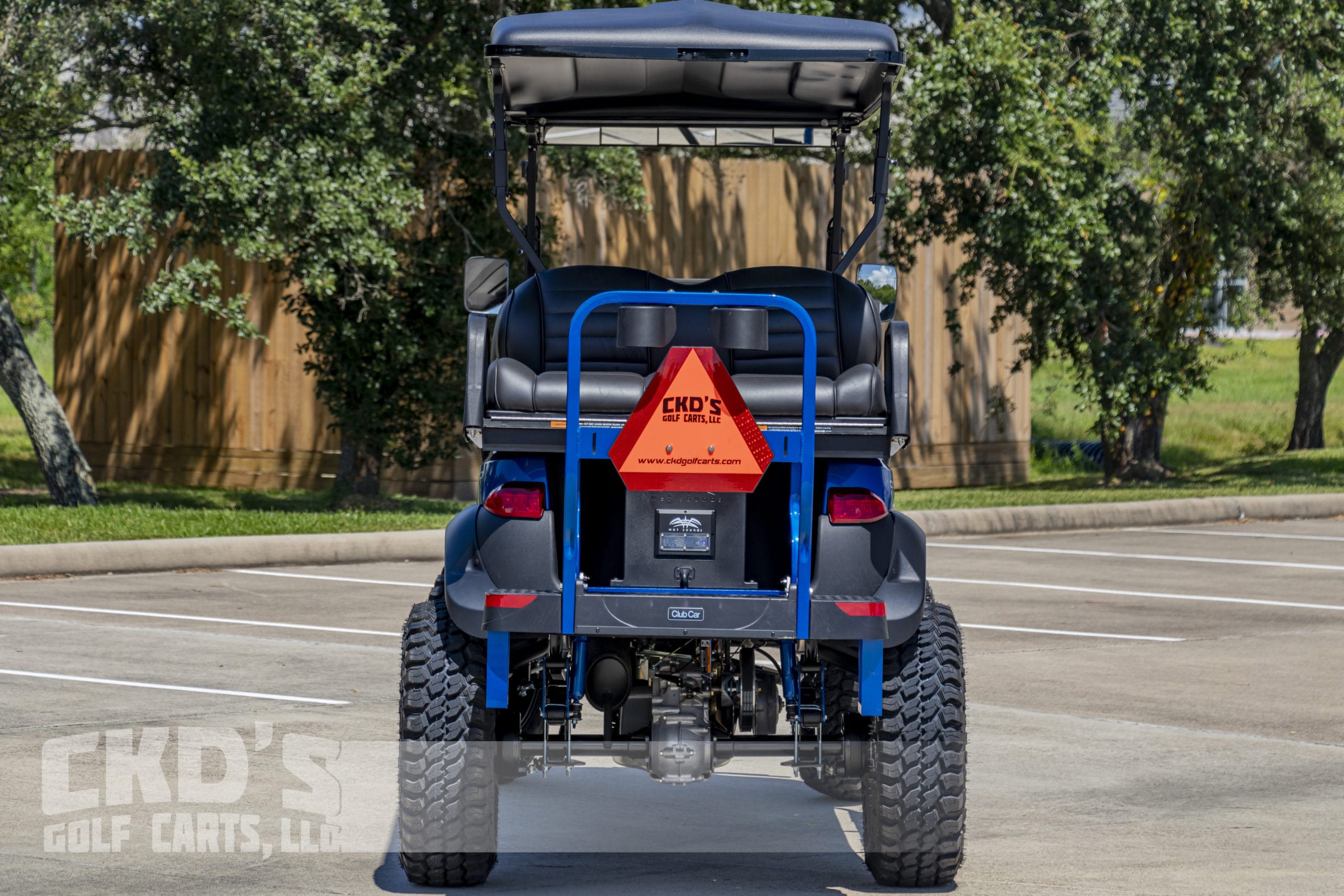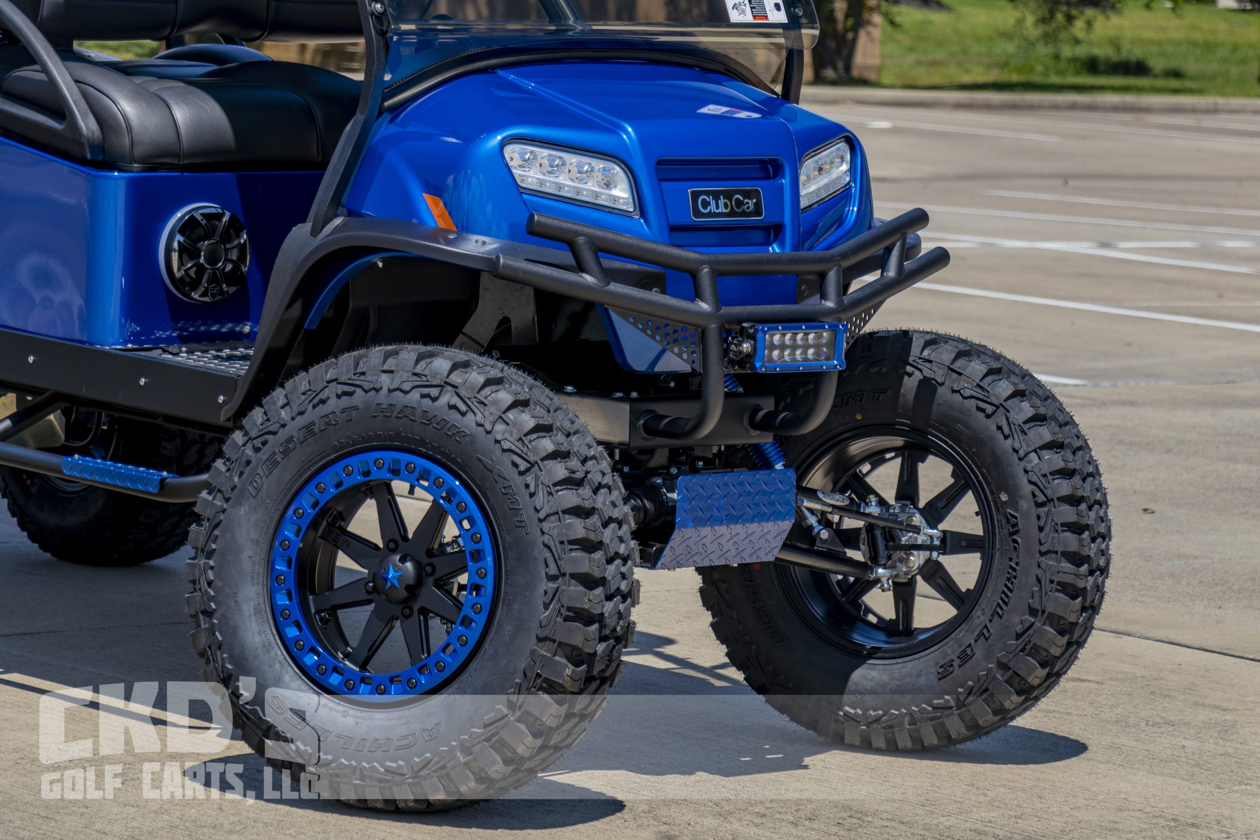 Custom-built 2019 Club Car Onward 6-passenger stretched “Monster” EFI gas-powered ‘limo’ golf cart! We have custom-built this fine-looking machine using a like new 2019 Club Car Onward golf cart with the newest Subaru 14 HP EFI gas engine and we’ve used the best of the best on this cart! The cart has had our fresh full reconditioning service and the engine has been serviced as well! We’ve done a new 6-seater “stretch” conversion and installed the following accessories: the exciting tough-looking and unique Onward bodies that we custom-painted in Lightning Blue and installed an 11″ new style heavy duty USA-made All Sports Long Travel lift with front nitrogen shocks (for the smoothest ride!), Heavy-duty rear leaf springs, newest style 15″ MSA M31 LOK II wheels with huge 30″ Desert Hawk radial tires, custom black powder-coated nerf bars with color-matched diamond plate steps, custom black Club Car Premium seats that are super comfortable and super stylish, front heavy-duty brush guard with 6” RGB Backlit LED light bar, Front color-matched seat pod with under-seat storage area, 112″ black extended top with built-in RGB LED accent lighting (change it to any color you’d like with an app on your phone.) This cart also features our new fold-down top system so you can fit it in your toy hauler or even your standard garage!
