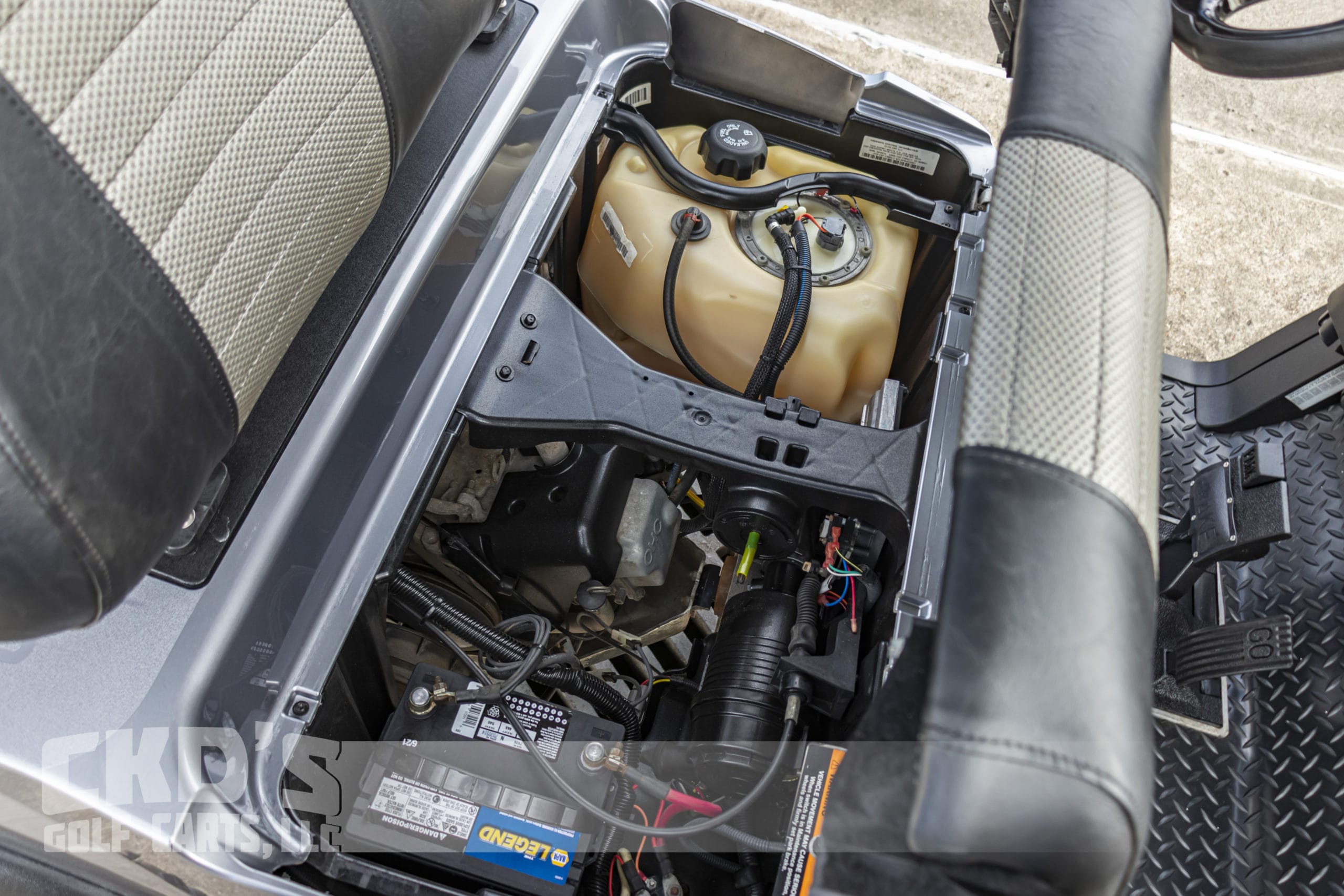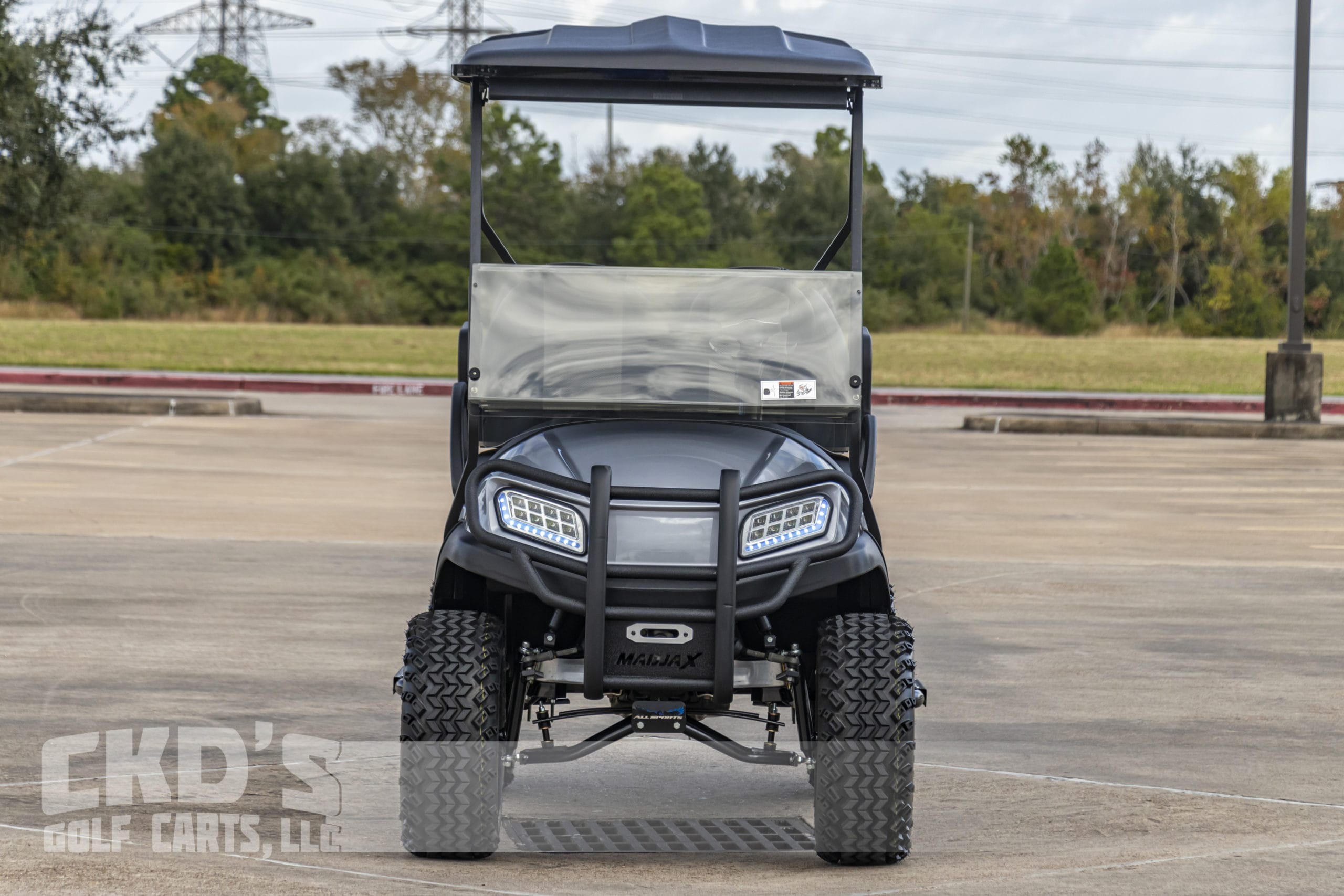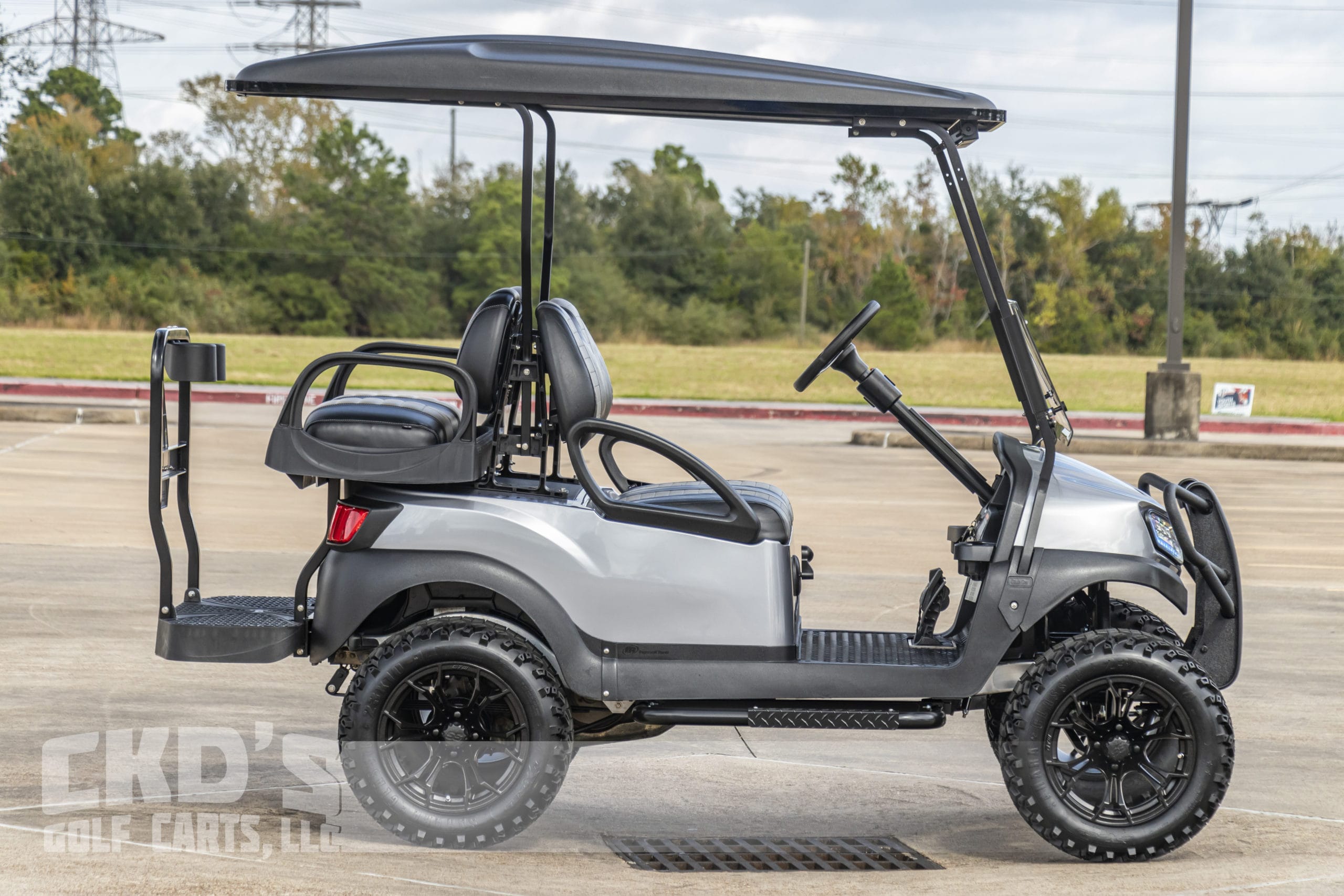 Custom built 2019 Club Car Tempo fuel-injected, lifted gas golf cart, with the newer Subaru electronic fuel injected gas engine! Like all of our carts, this cart has had a fresh full reconditioning service and the following accessories have been installed: huge Trojan AGM starter battery, All Sports 6″ A-Arm lift kit, heavy-duty rear leaf springs, 23″ tires mounted on 14″ matte black Spyder wheels, professionally painted Ingot Silver Metallic Tempo bodies, new style black diamond plate rubber floor mat, black 80″ top with the built-in track in which we can install RGB (color-changing) LED lights. New style Black and Grey Carbon Fiber seats, black powder-coated USA-made Max 5 rear flip seat with stainless hardware, black plastic (no-rust) footpan, hidden storage compartment (ice chest) and swivel cup-holders. Custom black steering wheel with black hub adapter, dual USB charging ports, Ultimate LED light kit (includes LED headlights, day-time running lights, taillights, brake lights, emergency flashers, turn signals and horn), custom made black powder coated nerf bars with black diamond plate steps, black powder-coated MadJax HD Tempo brush guard with built-in winch mount. The cart also has a tinted folding “magnetic mount” windshield, 5-panel mirror and SMV (slow-moving vehicle) sign.