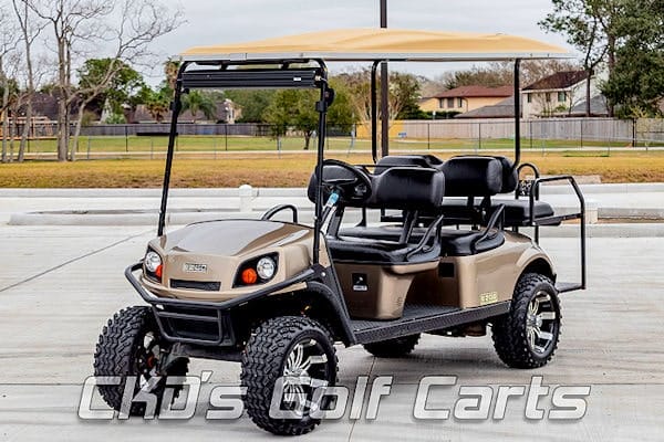 We are selling on consignment a 2019 EZGO L6 Express gas 6-passenger lifted “limo” golf cart, in Champagne color. This cart has the Kawasaki FE400 gas engine and it has just been recently serviced! It purrs like a kitten and gets about 25 mpg with it’s 6 gallon gas tank. It has a black OEM style upholstery, a factory rear flip seat and rear safety/grab bar. It also has 14″ Black and Machined Tempest wheels with 23″ tires, brush guard, 112″ tan extended top with built-in track in which we can install colored LED accent lights, black rubber diamond plate style floor mat. It has a basic light kit (includes headlights, taillights and horn), fuel gauge, DS1 Bluetooth Powersports sound bar (that cranks really loud and sounds awesome!), mirror and SMV sign!