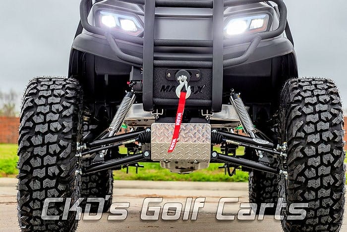Custom-built 2020 Club Car Tempo 6-passenger stretched “Monster” EFI gas-powered ‘limo’ golf cart! We have custom-built this fine-looking machine using a like new 2020 Club Car Tempo golf cart with the newest Kohler 14 HP EFI gas engine and we’ve used the best of the best on this cart! The cart has had our fresh full reconditioning service and the engine has been serviced as well! We’ve done a new 6-seater “stretch” conversion and installed the following accessories: the exciting tough-looking and unique Tempo bodies that we custom-wrapped in Platinum Grey and the just now introduced 11″ new style heavy duty USA-made All Sports Long Travel lift (for the smoothest ride!) Heavy-duty rear leaf springs, newest style 15″ MSA M21 LOK wheels with huge 30″ EFX MotoVator radial tires, custom black powder-coated drop-down style nerf bars with diamond plate steps, custom black with liquid silver wave double diamond hand-stitched upholstery with French stitching, custom front MadJax heavy-duty Tempo brush guard with winch mount and a Warn 2000 pound remote-operated winch! Front color-matched seat pod with under-seat storage area, 112″ black extended top with built-in RGB LED accent lighting (change it to any color you’d like with an app on your phone.) This cart also features our new fold-down top system so you can fit it in your toy hauler or even your standard garage!