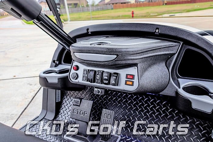 New style Sentry dash with large top-loading locking storage bin and color-coordinating silver trim inserts, dual USB charging ports, garage door opener, accessory switches for the LED light bar and the RGB lights, and uncommon key (so no one steals your ride!) Custom black and silver steering wheel with black hub adapter, RGB LED underbody accent lights, 30″ dual row RGB back-lit LED light bar front-mounted on the roof, tinted folding “magnetic latch” windshield, overhead 5-panel mirror, side-mounted rearview mirrors, large maintenance-free AGM starter battery to start the cart and power all of the 12-volt accessories, and slow-moving vehicle (SMV) sign. This cart is sweet!