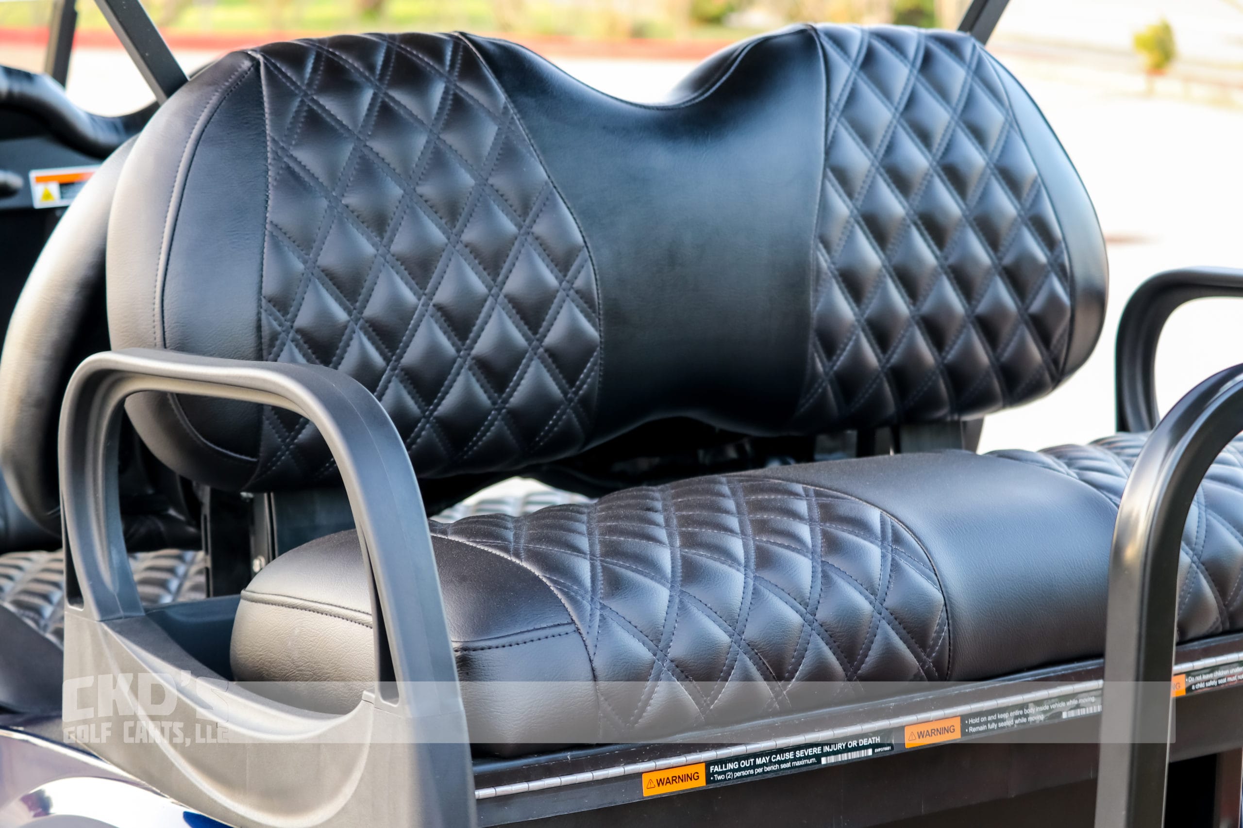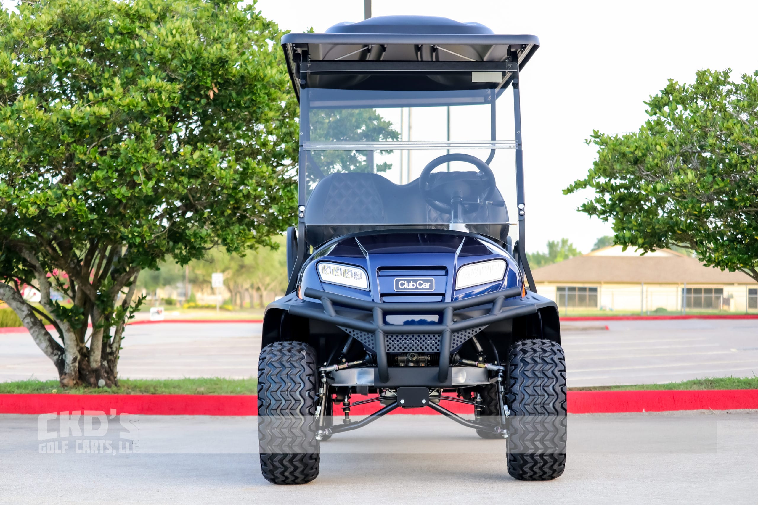Like new 2022 Metallic Blue Onyx Club Car Onward EFI Gas Lifted Limo Golf Cart. This cart is literally like new and has very low hours on it! It came from the Club Car factory in Blue Metallic Onyx color, black 112″ long top (in which we can install a custom weather enclosure or new style LED strip lights), custom black and blue double diamond hand stitched upholstery, Max 5 style rear flip seat with cooler box and swivel cup-holders, factory 6″ lift kit with heavy duty rear leaf springs, 14″ Mercury Black and Machined wheels with 23×10-14 all-terrain tires, 4 wheel drum brakes (for maximum stopping power), second row cup-holders, dual USB charging ports, gas gauge and hour meter, USA made tinted folding “magnetic latch” windshield, under-seat storage tray on the center pod, Ultimate LED light kit (includes LED daytime running lights, LED headlights, taillights, brake lights, emergency flashers, horn and turn signals), tough looking Onward brush guard, comfort grip steering wheel, 5 panel mirror, custom seats and SMV sign.