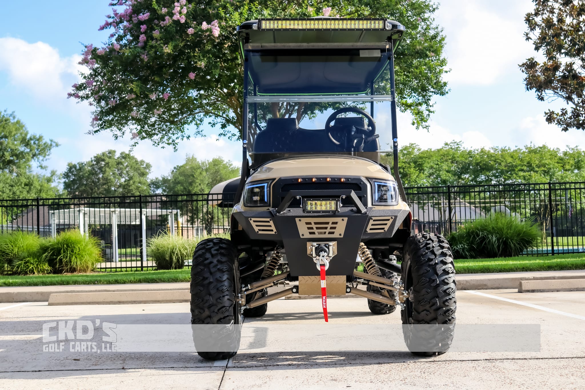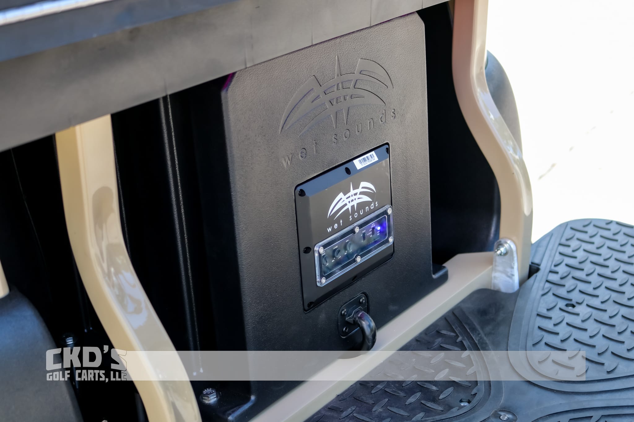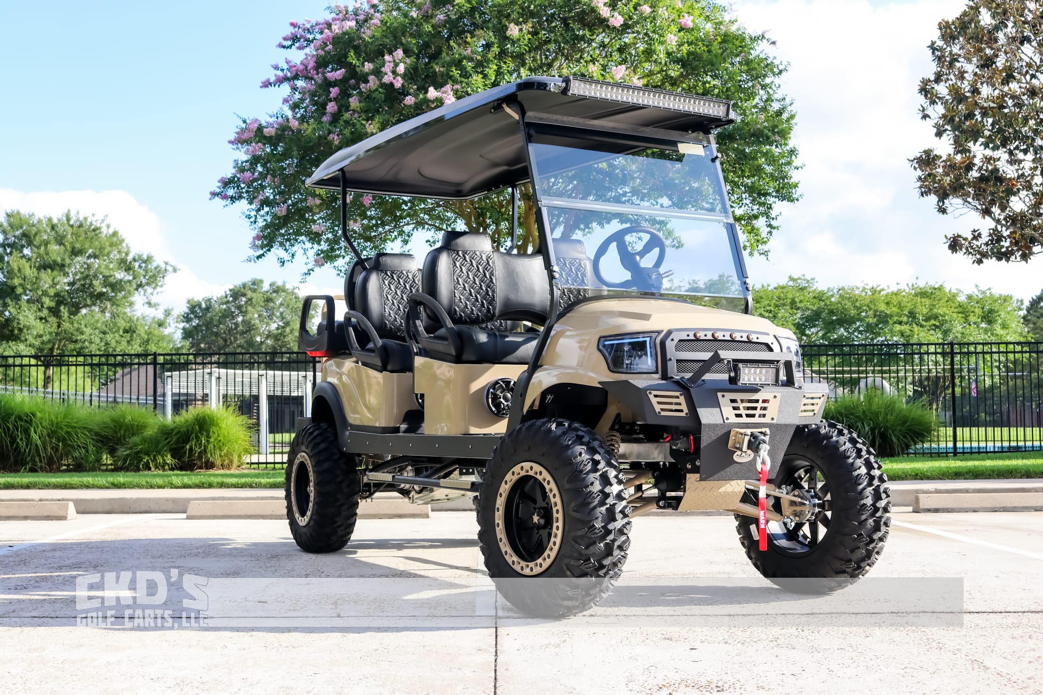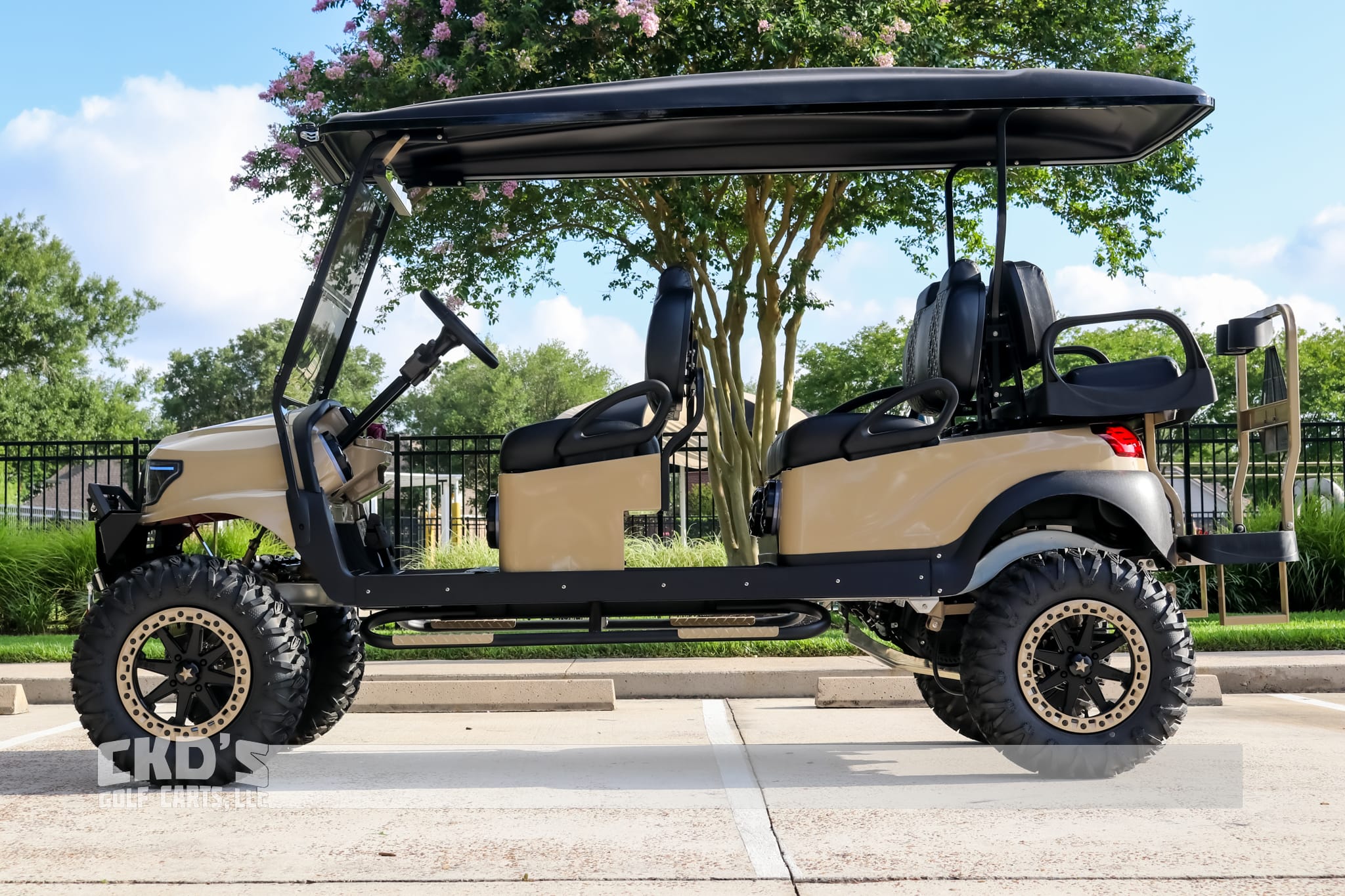 Custom-built 2022 Club Car Precedent 6-passenger stretched “Mini-Monster” EFI gas-powered ‘limo’ golf cart! We have custom-built this fine-looking machine using a like new 2022 Club Car Precedent golf cart with the Kohler 14 HP EFI gas engine and we’ve used the best of the best on this cart! The cart has had our fresh full reconditioning service and the engine has been serviced as well! We’ve done a new 6-seater “stretch” conversion and installed the following accessories: the exciting tough-looking and unique Alpha bodies that we custom-painted in Toyota Desert Tan and installed an 8″ new style heavy duty USA-made All Sports Long Travel lift (for the smoothest ride!), Heavy-duty rear leaf springs, newest style 15″ MSA M31 Lok 2 wheels with Desert Tan painted accents and huge 28″ EFX MotoClaw radial tires, Max 5 rear flip seat with built-in LED reverse lights, custom black powder-coated nerf bars with color-matched Desert Tan diamond plate steps, custom Tuxedo Executive seats that are super comfortable and super stylish, custom front MadJax heavy-duty Alpha Armor brush guard with winch mount, Desert Tan painted accents and a Warn 2000 pound remote-operated winch! Front color-matched seat pod with under-seat storage area, custom steering wheel with hub adapter, 112″ black extended top with built-in RGB LED accent lighting (change it to any color you’d like with an app on your phone). The cart has a full on Wetsounds stereo system including the following: Wetsounds MC-20 Bluetooth media Center, (3) sets of Wetsounds Revo 6 speakers with RBG rings, (1) set of Wetsounds Revo 8 speakers with RBG rings, Wetsounds HTX-6 amplifier and a Wetsounds Stealth AS-10 powered subwoofer! This stereo cranks! Custom designed Dek-It floor mat, uncommon key (so no one steals your ride!), wireless garage door opener, 2nd and 3rd row cup-holders and dual USB charging ports!