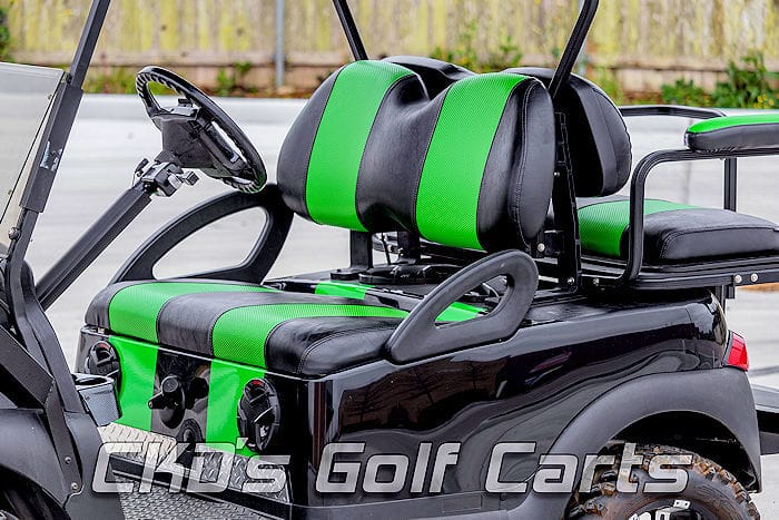We are selling on consignment a 2007 Club Car Precedent lifted gas-powered golf cart with the Kawasaki FE350 engine that has been freshly serviced. The cart runs and looks good, has a brand new starter battery and is good to go! OEM Black body with added vinyl green racing stripes, 6″ USA made A-Arm lift kit, heavy duty rear leaf springs, Ultimate light kit (includes headlights, taillights, brake lights, emergency flashers and a horn), custom Black and Green Wave upholstery with matching rear seat cup holder armrests, 80″ black top with dual row 34″ LED off-road style light bar to light up the night, smaller LED light bar above the rear seat for a reverse light, 14″ black and machined Tempest wheels with 23″ Sahara Classic tires, USA-made black powder coated aluminum Deluxe Safety rear flip seat, brush guard with 2″ hitch receiver, front-mounted clay’s basket for extra storage, black rubber diamond plate floor mat, diamond plate kick plate, carbon fiber dash with locking glove box, JVC AM/FM/CD/MP3 and Bluetooth stereo with (4) Sony speakers, nerf bars with diamond plate steps, tinted folding windshield, and 5-panel mirror.