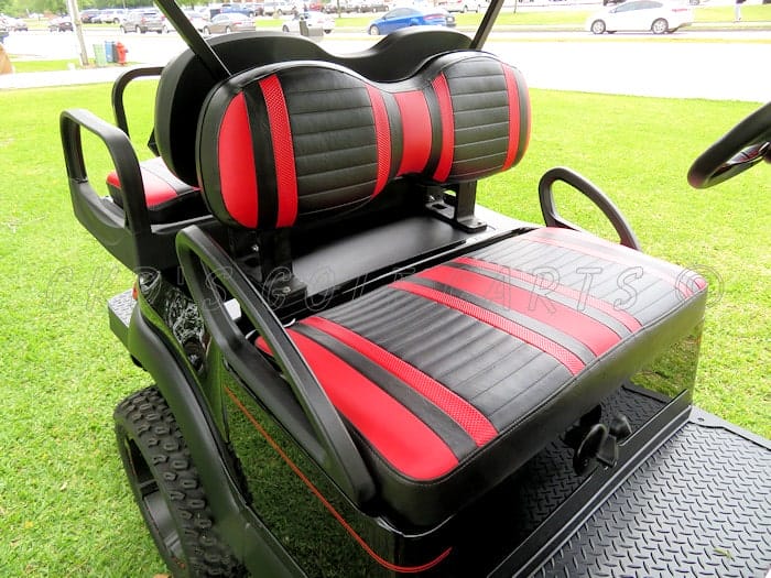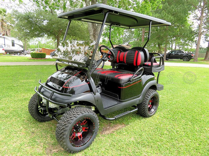2013 Club Car Precedent gas golf cart with the renowned Kawasaki FE350 gas engine! Like all of our carts, this cart and engine have had a fresh full reconditioning service, and the following accessories have been installed: Jet Black OEM bodies with custom red pin striping, 6″ USA-made A-Arm lift, heavy duty rear leaf springs, 14″ Radiant Red HD7 custom wheels with 23″ tires, 80″ black extended top with built-in weather enclosure track, custom Black and Red Extreme Striped upholstery, USA-made Max 5 rear flip seat with unique built-in combo ice chest/storage box, stainless hardware, black plastic (rust-free!) footpan and rear safety bar. Ultimate LED light kit (includes LED headlights, LED taillights and LED brake lights, turn signals, emergency flashers and a horn), tinted folding windshield, 5-panel mirror, black rubber diamond plate style floor mat, Black Metallic dash with locking glove box, newest model Powerbass XL-1200 Bluetooth sound bar that cranks extremely loud and sounds awesome! Custom made black powder coated nerf bars with black diamond plate steps, custom black steering wheel with red stitching and black hub adapter, black powder coated brush guard with built-in hitch receiver, red underbody LED colored accent lights, and slow moving vehicle (SMV) sign. This cart is sweet!