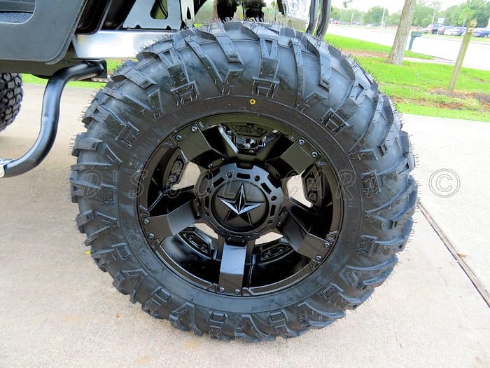 Go BIG or go home! Custom built 2014 Club Car Precedent fuel injected ‘Monster’ lifted gas golf cart, with the newer Subaru electronic fuel injected gas engine! Like all of our carts, this cart and engine have had a fresh full reconditioning service, and the following accessories have been installed: our famous 11″ A-Arm lift kit, heavy duty rear leaf springs, automotive style shocks front and back, huge 30″ EFX Motovator tires mounted on 16″ MSA Rockstar II wheels, wheel spacers to give the cart a wider stance, Charcoal Grey Metallic bodies, black 80″ top with built-in track in which colored LED’s can be installed, Black on Black Extreme Striped seats, black powder coated USA made Guardian rear flip seat with stainless hardware and black plastic (no-rust) footpan, and drop down step to make it easier to get in and out of the rear seat. Tinted folding windshield, 5-panel mirror, new style black metallic dash with locking glove box, Ultimate LED light kit (includes LED headlights, taillights, brake-lights, emergency flashers, turn signals and horn), custom black on black steering wheel with black hub adapter, custom made black powder coated drop down nerf bars with diamond plate steps, black powder coated brush guard with built-in hitch mount, the all new Powerbass XL-1200 500 watt Powersports Bluetooth sound bar, and SMV sign.