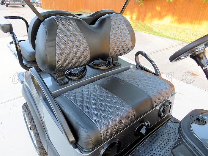 Like new 2015 Club Car Precedent gas golf cart with the newer 14 HP Subaru E.F.I fuel injected gas engine! Like all of our carts, this cart and engine have had a fresh full reconditioning service, and the following accessories have been installed: 6″ USA-made A-Arm lift, heavy duty rear leaf springs, 14″ Black Chrome Tempest wheels with 23″ tires, Charcoal Grey Metallic OEM style bodies, 80″ black extended top with built in track for LED accent lighting, USA-made Guardian rear flip seat with stainless hardware, black plastic (rust free!) footpan, Ultimate LED light kit (includes LED headlights, LED taillights and LED brake lights, turn signals, emergency flashers and a horn), tinted folding windshield, 5-panel mirror, black rubber diamond plate style floor mat, custom Black with Black Carbon Fiber Double Diamond Hand Stitched upholstery with matching rear seat armrest/cup holders, new style black Sentry dash with large, top loading, locking storage bin and Charcoal Grey Metallic inserts, in-dash Sony Marine 200 watt Bluetooth stereo, (4) Sony marine grade speakers, antenna, custom made black powder coated nerf bars with black diamond plate steps, custom black and Charcoal Grey Metallic steering wheel with black hub adapter, black powder coated brush guard with built-in hitch receiver, pre-wired for underbody LED lights, pre-wired for roof-mounted 32″ single row LED light bar, and slow moving vehicle (SMV) sign. This cart is sweet!