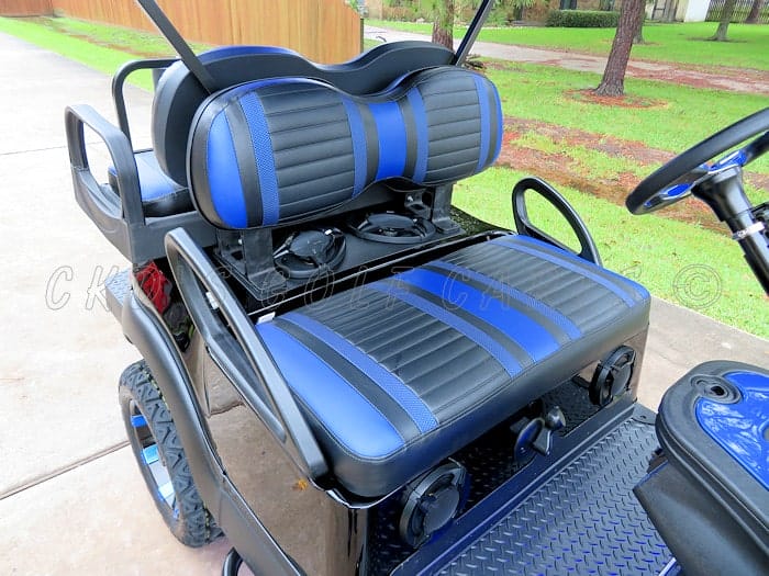 Like new 2015 Club Car Precedent gas golf cart with the newer 14 HP Subaru E.F.I fuel injected gas engine! Like all of our carts, this cart and engine have had a fresh full reconditioning service, and the following accessories have been installed: 6″ USA-made A-Arm lift, heavy duty rear leaf springs, 14″ Black and Blue anodized Tempest wheels with 23″ Black Trail tires, Jet Black Phantom style bodies, 80″ black extended top with built-in track with blue LED accent lighting, USA-made Max 5 rear flip seat with stainless hardware, unique built-in combo ice chest/storage box, black plastic (rust free!) footpan, and rear safety bar with fold-away drink holders, Ultimate LED light kit (includes LED headlights, LED taillights and LED brake lights, turn signals, emergency flashers and a horn), tinted folding windshield, 5-panel mirror, black rubber diamond plate style floor mat, custom Black with Blue Extreme Striped seats, new style black Sentry dash with large top loading, locking storage bin and blue trim inserts, in-dash Sony Marine 200 watt Bluetooth stereo, (4) Sony marine grade speakers, antenna, custom made black powder coated nerf bars with black diamond plate steps, custom black and blue steering wheel with black hub adapter, black powder coated brush guard with built-in LED mounting tabs, blue underbody LED lights, and slow moving vehicle (SMV) sign. This cart is sweet!