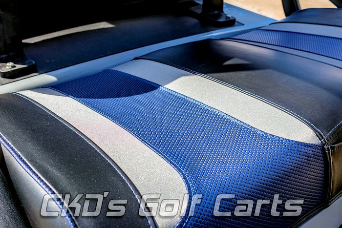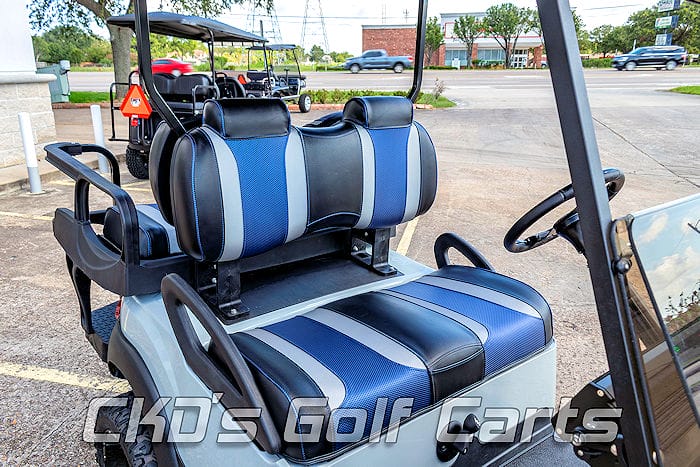 Like new 2016 Club Car Precedent gas golf cart with the newer 14 HP Subaru E.F.I fuel injected gas engine! Like all of our carts, the cart and engine have had a fresh full reconditioning service and the following accessories have been installed: 6″ USA-made A-Arm lift, heavy duty rear leaf springs, newest style 14″ gloss Black Yellow Jacket wheels with 23″ Sierra Classic tires, new Grey OEM bodies, 80″ extended black top with built-in track in which we can install RGB (colored) LED accent lighting, custom Black with Silver and Blue Wave Tsunami seats (Cowboy colors!), the unique USA-made Max 6 rear flip seat with concealed ice chest/storage compartment, stainless hardware and black plastic (rust free!) footpan. New Powerbass XL-1000 Bluetooth Powersports sound bar, Ultimate LED light kit (includes LED headlights, LED tail lights, LED brake lights, LED turn signals, emergency flashers and a horn), tinted folding “non-squeak” windshield, overhead 5-panel mirror, custom black steering wheel with black hub adapter, blue underbody LED accent lighting, and slow moving vehicle (SMV) sign. This cart is sweet!