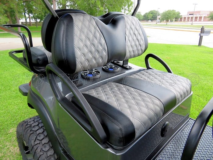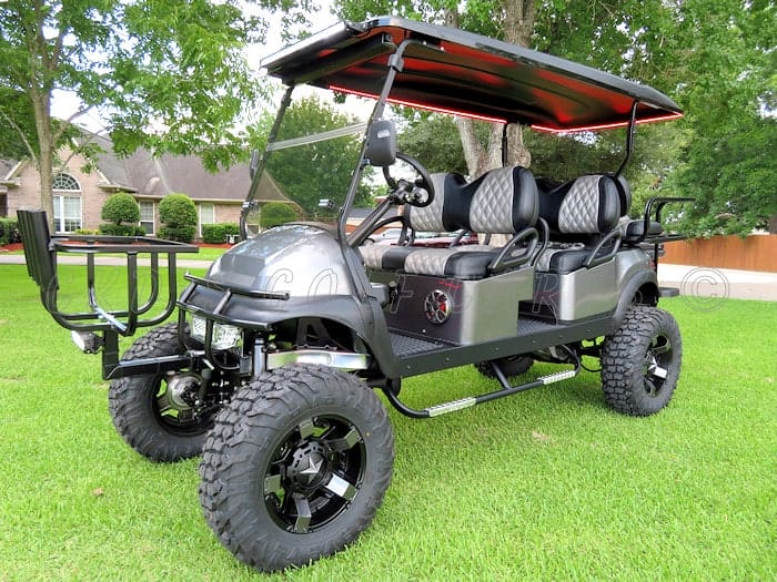 Fully and completely customized 2016 Club Car Precedent stretched 6-seater gas-powered fuel injected “Limo” golf cart. This cart has the Subaru 14 HP E.F.I. engine and like all of our carts, the entire cart has had a fresh full reconditioning service. It features a new custom stretch conversion, and the following: “Monster” 11″ All Sports lift kit, heavy duty rear leaf springs, heavy duty rear air shocks on the back and heavy duty air shocks on the front, 16″ KMC Rockstar II Matte Black wheels with custom body color-matched stars and spokes, and huge 30″ EFX MotoVator steel belted radial tires, and wheel spacers for a wider stance! Charcoal Grey Metallic OEM style bodies, custom Wetsounds sound system with 4 channel HTX Series amp, Sony Bluetooth Marine stereo, (4) Wetsounds Revo 6.5″ RGB speakers with Gunmetal Grey speaker covers, Wetsounds Stealth 10 amplified Subwoofer, black 112″ extended top, USA-made Deluxe Safety rear flip seat with stainless hardware, rear “helper” step, black plastic (rust free!) footpan and stainless hardware. Custom made Black with Liquid Silver Wave Double Diamond Stitched seats, RGB LED accent lighting throughout the underbody and in the underside of the roof that is controlled by an app on your phone, new style Black Sentry dash with Graphite trim inserts, and large top-loading locking storage bin. custom color-coordinating black and Graphite steering wheel, black powder coated brush guard with built-in hitch mount, hitch-mounted custom cooler rack with fishing rod holders, custom made drop down style black powder coated nerf bars with diamond plate steps, second row seat cup-holders, uncommon key so no one steals your ride, Ultimate LED light kit (includes LED headlights, LED taillights, LED turn signals, brake lights, emergency flashers and a TRAIN HORN (this thing is super loud!), 5 panel mirror, side-mounted rear view mirrors, 32″ single row Cree LED light bar, 12″ dual row Cree LED light bar mounted with quick disconnect on cooler mount bracket, tinted folding windshield, rear disc brakes for increased stopping power, high torque clutch spring, Kevlar drive belt, and slow moving vehicle (SMV) sign. The cart rides extremely smooth, goes really fast and is a real head turner! We have also installed our all-new folding top system on this cart so you can fit it in your toy hauler or even your standard garage!