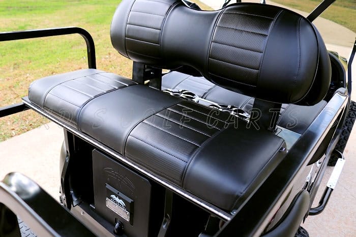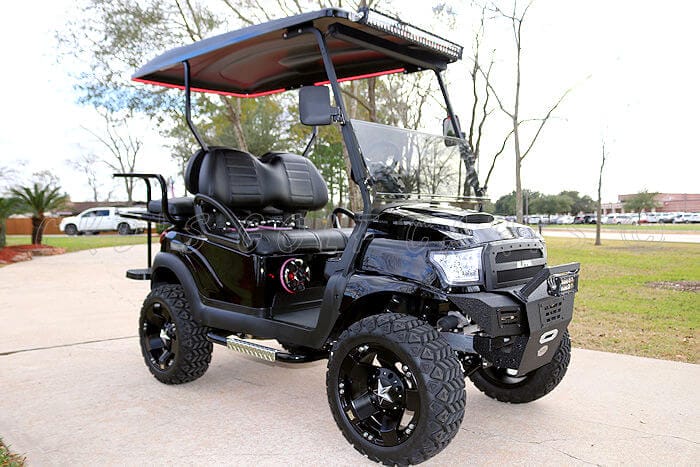 Introducing the new tough-looking custom Alpha Off-Road body built on a like new 2017 Club Car Precedent fuel injected gas golf cart! This cart has the newer style fuel-injected Subaru engine in it and like all of our carts, it has had a fresh full reconditioning service and the engine as been freshly serviced! In customizing the cart we have installed the following items: 6″ USA made A-Arm lift, heavy duty rear leaf springs, 15″ Matte Black KMC Rockstar XD series wheels with 23″ 4-ply Black Trail tires, new custom Jet Black Alpha Off-Road bodies with blacked-out hood scoop and grill, 80″ black extended top with built-in track with new style RGB LED’s. Custom black on black carbon fiber hand-pleated seat upholstery, USA-made Guardian black powder coated aluminum rear flip seat with stainless hardware and black plastic (rust-free) footpan! Ultimate LED light kit (includes LED headlights, LED taillights, LED brake lights, LED turn signals, LED emergency flashers, day-time running lights and a horn), tinted folding magnetic mount windshield. New style black Sentry dash with large top-loading locking storage bin and black trim inserts and in-dash accessory switches including a built-in garage door opener, dual USB charging port, and switches for the colored LED lights and the LED light bars. Bluetooth dongle, (2) Wetsounds Revo 6 marine speakers with RGB LED rings, (2) Wetsounds Revo 8 speakers with RGB LED rings, Wetsounds HTX-4 400 watt marine amplifier and Wetsounds AS-10 powered subwoofer. Custom black steering wheel with chrome inserts and black hub adapter, custom made black powder coated nerf bars with chrome diamond plate steps, custom MadJax Armor combo bumper/brush guard with 6″ dual row LED light bar with RGB back-lighting, RGB underbody LED accent lights, and front roof-mounted super bright 30″ double row LED light bar with RGB back-lighting. 5-panel overhead mirror, side-mounted rear view mirrors, new style black carbon floor mat, (2) dual USB charging ports, huge AGM starter battery system to start the cart and power the 12 volt accessories, and slow moving vehicle (SMV) sign included (not shown in photos but will be installed before delivery).