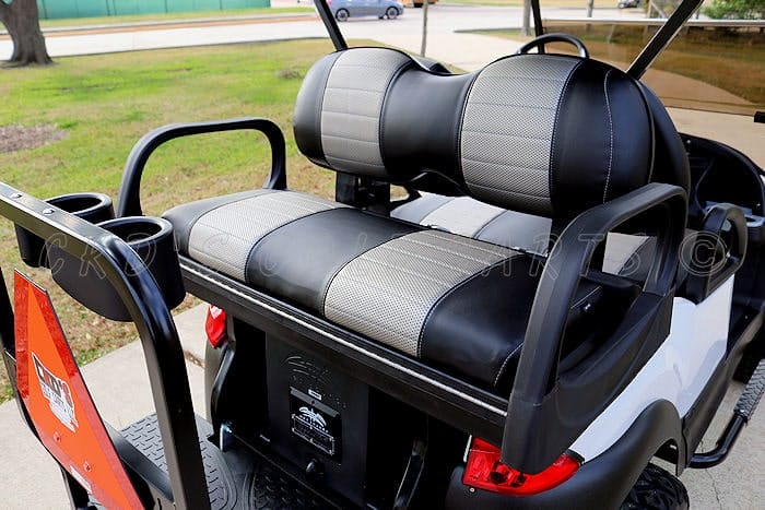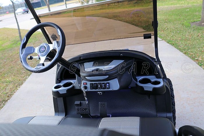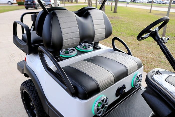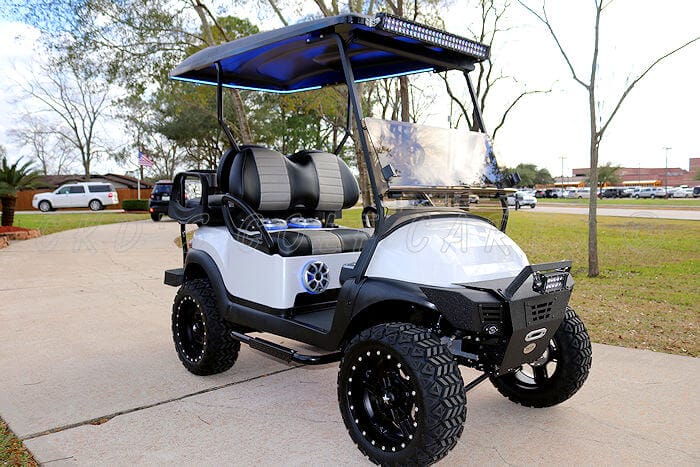 Like new 2017 Club Car Precedent gas golf cart with the newer 14 HP Subaru E.F.I fuel injected gas engine! Like all of our carts, the cart and engine have had a fresh full reconditioning service and the engine as been freshly serviced! In customizing the cart we have installed the following items: 6″ USA-made A-Arm lift, heavy duty rear leaf springs, newest style 15″ Black MSA M32 Axe wheels with 23″ Black Trail tires, new Pearl White Metallic OEM style bodies, 80″ extended black top with built-in track in which we have installed RGB (color changing) LED accent lighting, custom Black with Liquid Silver Wave hand-pleated seats, unique USA-made Max 5 rear flip seat with stainless hardware, swing-away rear cup holders and black plastic (rust free!) footpan. Ultimate LED light kit (includes LED headlights, LED tail lights, LED brake lights, LED turn signals, emergency flashers and a horn), black powder coated Armor Bumper with built-in winch mount, 6″ Plashlights RGB back-lit headlight light bar, black powder coated nerf bars with black diamond plate steps, overhead 5-panel mirror, Wetsounds Bluetooth connection dongle, Wetsounds HTX-4 400 watt amplifier, Wetsounds Revo 6 speakers with RGB light rings, Wetsounds Revo 8 speakers with RGB light rings, and Wetsounds AS-10 subwoofer for some bump in your trunk! Custom black with silver accents Sentry dash with large top-loading locking storage bin, and front mounted accessory switches (to control the RGB underbody LEDs, dual USB power points, overhead LED lights), custom black and silver steering wheel with black hub adapter, RGB underbody LED accent lighting, newest style black carbon fiber floor mat, huge AGM battery system to start the cart and run all the 12 volt accessories, roof-mounted 30″ dual row LED off-road style light bar with RGB back-lighting (to light up the night!), tinted folding “non-squeak” windshield, and slow moving vehicle (SMV) sign. This cart is sweet!