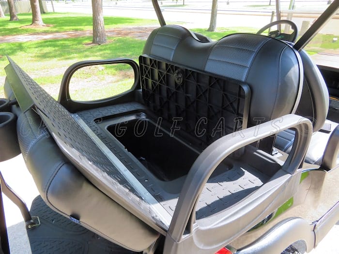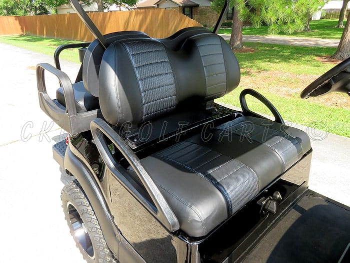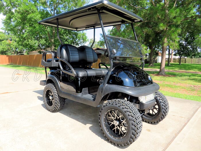 Like new 2017 Club Car Precedent gas golf cart with the newer 14 HP Subaru E.F.I fuel injected gas engine! Like all of our carts, this cart and engine have had a fresh full reconditioning service, and the following accessories have been installed: 6″ USA-made A-Arm lift, heavy duty rear leaf springs, newest style 14″ Black and Machined Vortex wheels with 23″ tires, new Black OEM style bodies, 80″ extended black top with built-in track for weather enclosure, the unique USA-made Max 5 rear flip seat with concealed ice chest/storage compartment, stainless hardware and black plastic (rust free!) footpan. Basic LED light kit (includes LED headlights, LED taillights, and a horn), tinted folding windshield, overhead 5-panel mirror, custom Black with Rocket Wave hand-pleated style seats, swing-away rear seat cup-holders, and slow moving vehicle (SMV) sign. This cart is sweet!