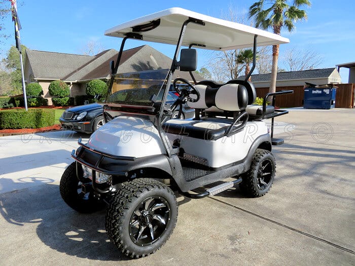 Like new 2017 Club Car Precedent gas golf cart with the newer 14 HP Subaru E.F.I fuel injected gas engine! Like all of our carts, this cart and engine have had a fresh full reconditioning service, and the following accessories have been installed: 6″ USA-made A-Arm lift, heavy duty rear leaf springs, newest style 14″ Blackhawk wheels with chrome inserts and 23″ tires, new Pearl White Metallic OEM style bodies, 80″ extended white top with built-in track for weather enclosure, USA-made Guardian rear flip seat with stainless hardware and black plastic (rust free!) footpan, Ultimate LED light kit (includes LED headlights, LED taillights and LED brake lights, turn signals, emergency flashers and a horn), tinted folding windshield, overhead 5-panel mirror, side-mounted rear view mirrors, black rubber diamond plate style floor mat, custom made black powder coated nerf bars with black diamond plate steps, diamond plate kick plate, custom Black with White Clubhouse Deluxe style seats, Powerbass USA XL-1000 Bluetooth Powersports sound bar, custom black steering wheel with black hub adapter, black powder coated brush guard with built-in hitch receiver, and slow moving vehicle (SMV) sign. This cart is sweet!