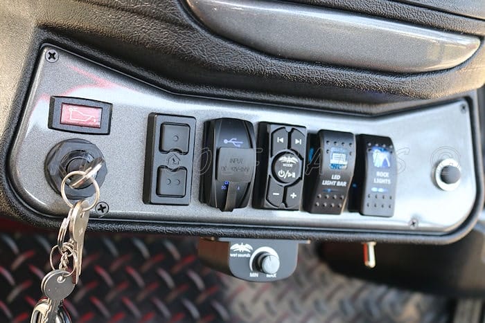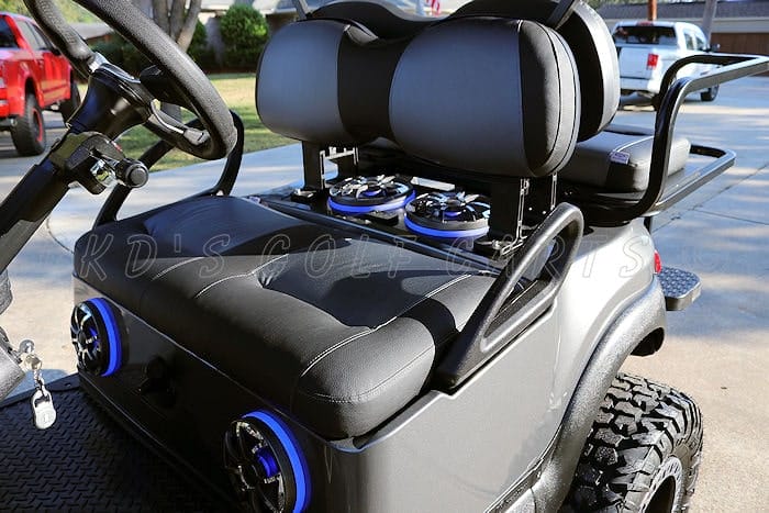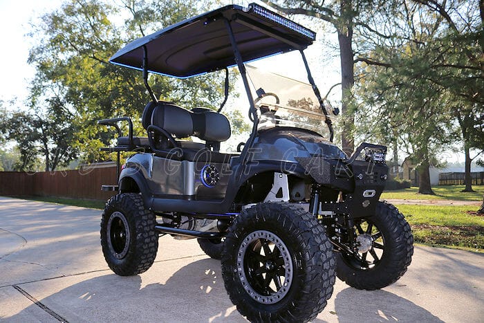 Go BIG or go home! Custom built 2017 Club Car Precedent fuel injected ‘Monster’ lifted gas golf cart, with the newer Subaru electronic fuel injected gas engine! Like all of our carts, this cart and engine have had a fresh full reconditioning service, and the following accessories have been installed: huge AGM starter battery, our famous 11 inch “monster” A-Arm lift kit, heavy duty rear leaf springs, front automotive style air shocks, and heavy duty shocks on the back, huge 30″ EFX Motovator tires mounted on 16″ MSA M31 Lok2 wheels, wheel spacers to give the cart a wider stance, new Charcoal Grey Metallic bodies, black diamond plate rubber floor mat, black 80″ top with built-in track in which we installed RGB (color-changing) LED lights, and our new folding top system that allows the roof to be lowered 7 inches so you can fit the cart in your standard garage or toy hauler! Graphite on Black new style Veranda seats, black powder coated USA-made Guardian rear flip seat with stainless hardware and black plastic (no-rust) footpan and drop down side steps to make it easier to get in and out of the rear seat. New style black Sentry dash with large locking glove box and color-coordinating graphite trim inserts, in-dash accessory switches (includes universal garage door opener, Wetsounds Bluetooth dongle, overhead LED light bar switch, 8″ LED light bar switch, dual USB ports and the top and bottom RGB color-changing LED light control), uncommon key (so no one steals your ride!), Ultimate LED light kit (includes LED headlights, taillights, brake-lights, emergency flashers, turn signals, and horn), 30″ dual row LED light bar mounted on the roof, custom black on graphite steering wheel with black hub adapter, custom made black powder coated nerf bars with graphite diamond plate steps (not shown in photos but will be installed), black powder coated MadJax Armor brush guard with built-in winch mount and 8″ Plashlights RGB back-lit LED light bar, (2) Wetsounds Revo 6 marine speakers with color-changing RGB lights and RGB rings, (1) pair Wetsounds Revo 8 speakers with color-changing RGB lights and RGB rings, 400 watt Wetsounds HTX-4 amplifier and 10″ powered Wetsounds subwoofer. This stereo system cranks really loud and sounds awesome! The cart also has a super loud ‘train horn’ so you don’t have to yell for people to get out of your way, all you have to do is press the button and no words are needed! >:) And SMV (slow moving vehicle) sign, tinted folding “squeakless” windshield, 5-panel mirror.