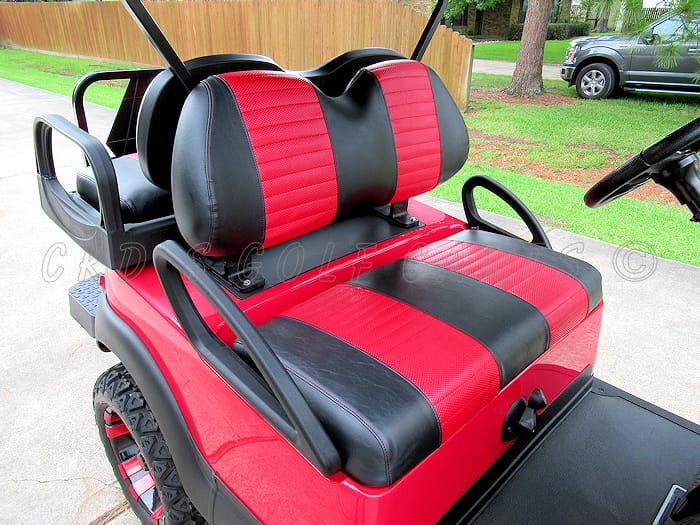 2018 Club Car Precedent gas golf cart with the newer 14 HP Subaru E.F.I fuel injected gas engine. This is a Club Car electric to gas, factory conversion that has new everything from the frame up! Like all of our carts, this cart has had a fresh full reconditioning service for items that are not new. The following accessories have been installed: 6″ USA-made A-Arm lift, heavy duty rear leaf springs, newest style 14″ Black and Red anodized Vampire wheels with 23″ Black Trail tires, new red OEM bodies, custom Black with Red Wave hand-pleated style upholstery, 80″ extended black top with built-in track for weather enclosure, the unique USA-made Max 5 rear flip seat with concealed ice chest/storage compartment, stainless hardware and black plastic (rust free!) footpan. Ultimate LED light kit (includes LED headlights, LED taillights, brake lights, turn signals, emergency flashers and a horn), custom black steering wheel with black hub adapter, black metallic dash with large locking glove box, black metallic dash trim, tinted folding windshield, overhead 5-panel mirror, and slow moving vehicle (SMV) sign. This cart is sweet!