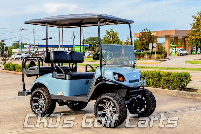 Like new DEMO – 2021 EZGO S4 Express lifted custom gas fuel injected golf cart. This cart is literally like new and it literally looks like new! The cart has the Walbro 13.5 HP EFI fuel injected gas engine, unique Ocean Grey factory S4 bodies, factory 5″ axle type lift, heavy duty rear leaf springs, 14″ Black and Machined Tempest wheels with 23″ tires, factory brush guard, factory black upholstery, USA-Made Max 5 rear flip seat with concealed ice chest/storage compartment under the cargo deck, stainless hardware and black plastic (rust free!) footpan, 80″ extended black top with built-in track in which we can install a custom weather enclosure, factory LED basic light kit, 5-panel mirror, horn, hour meter, USA-made tinted folding “non-squeak” windshield, and SMV sign. This cart is sweet!