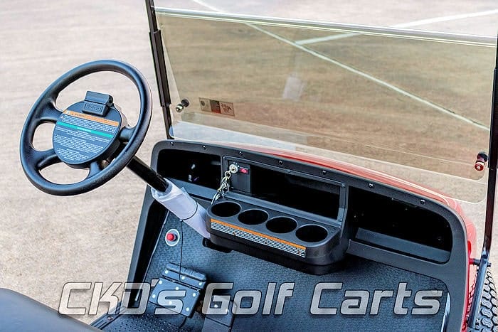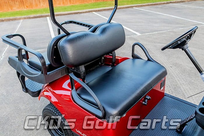 Like new demo 2021 EZGO Valor EFI gas golf cart with Burgundy bodies and the new fuel injected gas engine, factory 4″ lift, 15″ Matte Black Revenge wheels with low profile tires (not shown but installed and it makes it look sharp!), factory black upholstery, USA-made Max 6 Helix rear flip seat with concealed ice chest/storage compartment under the cargo deck, stainless hardware and black plastic (rust free!) footpan, 54″ factory black top with built-in grab handles, factory basic light kit, factory horn, tinted folding “magnetic mount” windshield, 5-panel mirror and SMV sign. This cart comes with the factory 2-year warranty!