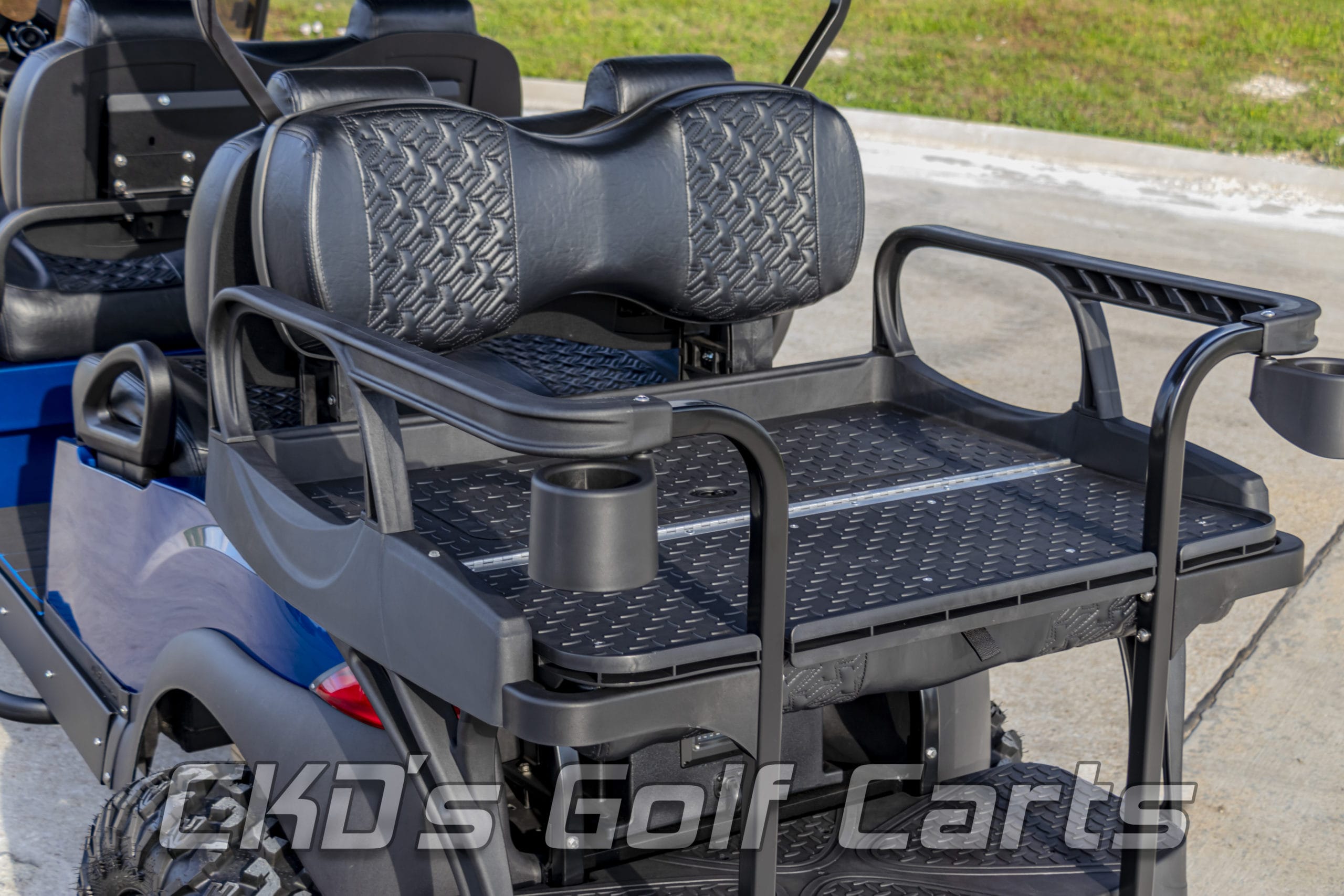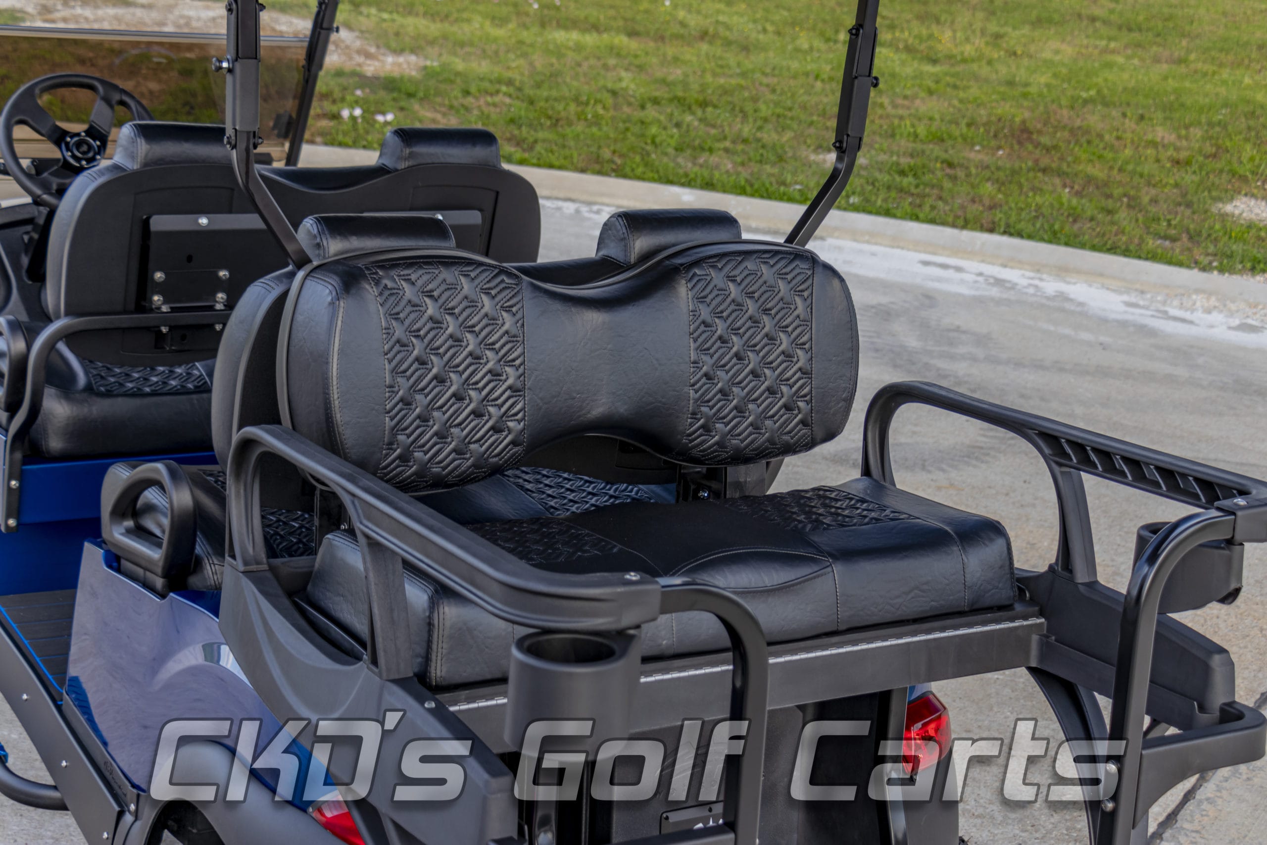 New style Sentry dash with large top-loading locking storage bin and black trim inserts, dual USB charging ports, garage door opener, accessory switches for the LED light bar and the RGB lights, and uncommon key (so no one steals your ride!) Custom black steering wheel with black hub adapter, RGB LED underbody accent lights, 30″ dual row RGB back-lit LED light bar front-mounted on the roof, tinted folding “non-squeak” windshield, overhead 5-panel mirror, large maintenance-free AGM starter battery to start the cart, and power all of the 12-volt accessories and slow-moving vehicle (SMV) sign. This cart is sweet!