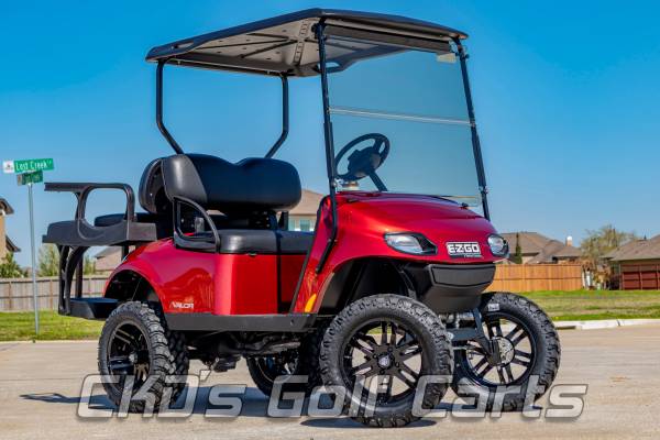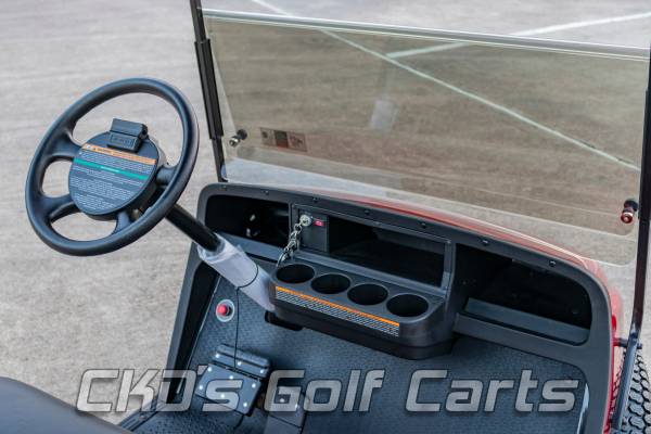 Like new demo 2021 EZGO Valor EFI gas golf cart with Burgundy bodies and the new fuel injected gas engine, factory 5″ USA Made axle type lift, 14″ Gloss Black Fairway Alloys Flex wheels with 23″ Hammer tires, factory black upholstery, USA-made Max 6 Helix rear flip seat with concealed ice chest/storage compartment under the cargo deck, stainless hardware, and black plastic (rust free!) footpad, 54″ factory blacktop with built-in grab handles, factory basic light kit, factory horn, tinted folding “magnetic mount” windshield, 5-panel mirror, and SMV sign. This cart comes with the factory 2-year warranty!