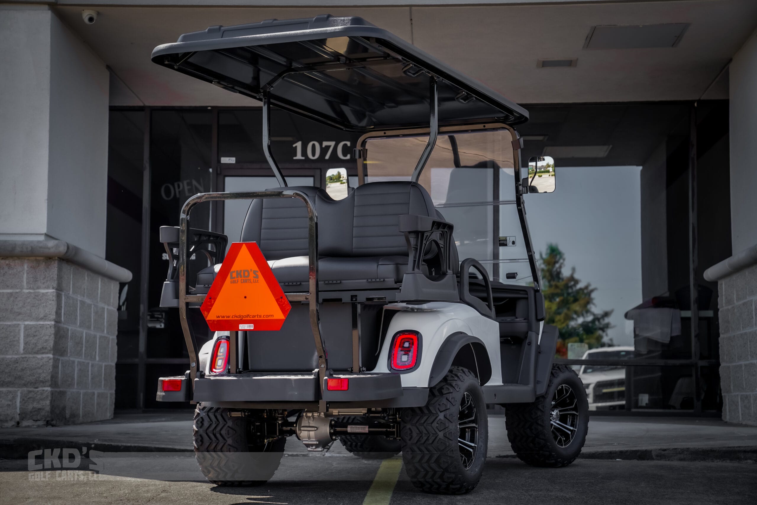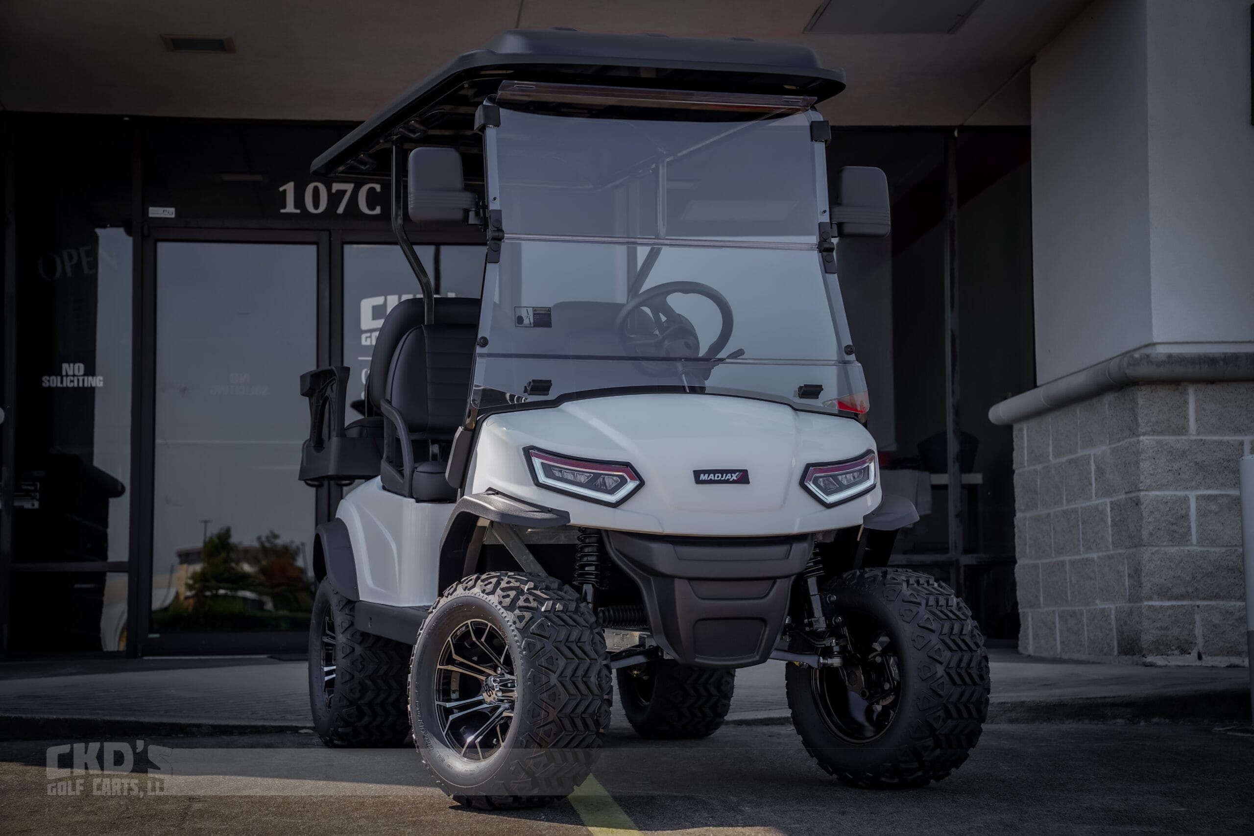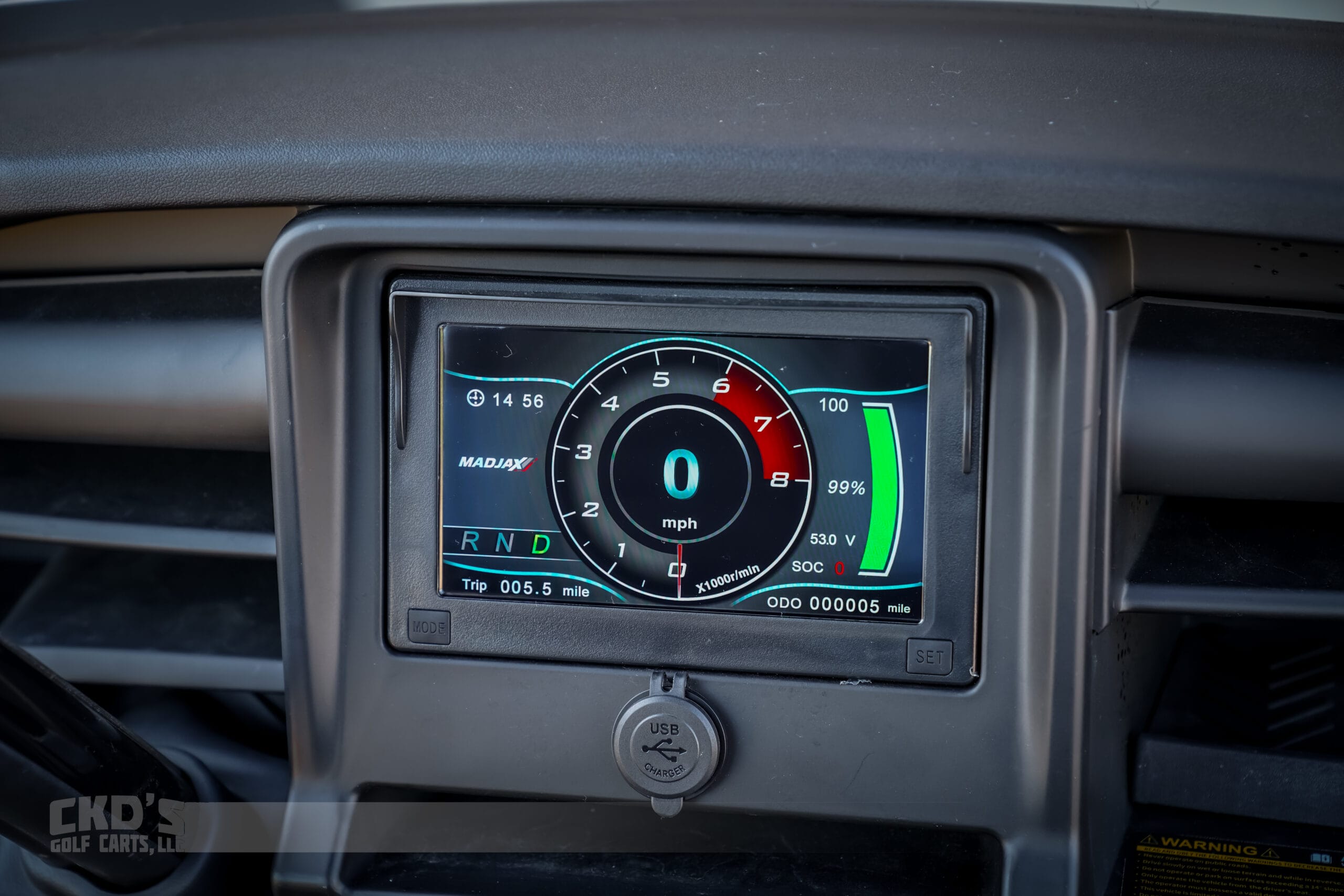 2024 MadJax E-Series custom lifted lithium golf cart. MadJax, a trusted name in the golf cart industry has come out with their new E-Series line of carts! These sleek, newly engineered carts come with a 6″ lift, custom bodies, custom seats, 80″ extended tops, independent front suspension, rear flip seat w/ hidden storage/ice chest, built in cup-holders on the rear seat arm-rests, rear grab bar, fender flares, custom 12″ wheels with 22″ tires, 7″ display showing speedometer, odometer, trip meter and state of charge meter, side view mirrors, clear folding windshield, dual USB charging ports, unique key. 105Ah Eco Battery lithium battery (for extended driving range) with limited 8 year warranty, onboard charger, onboard voltage reducer, Ultimate Light Kit (includes LED headlights, taillights, brake lights, turn signals, emergency flashers and a horn) and SMV sign.