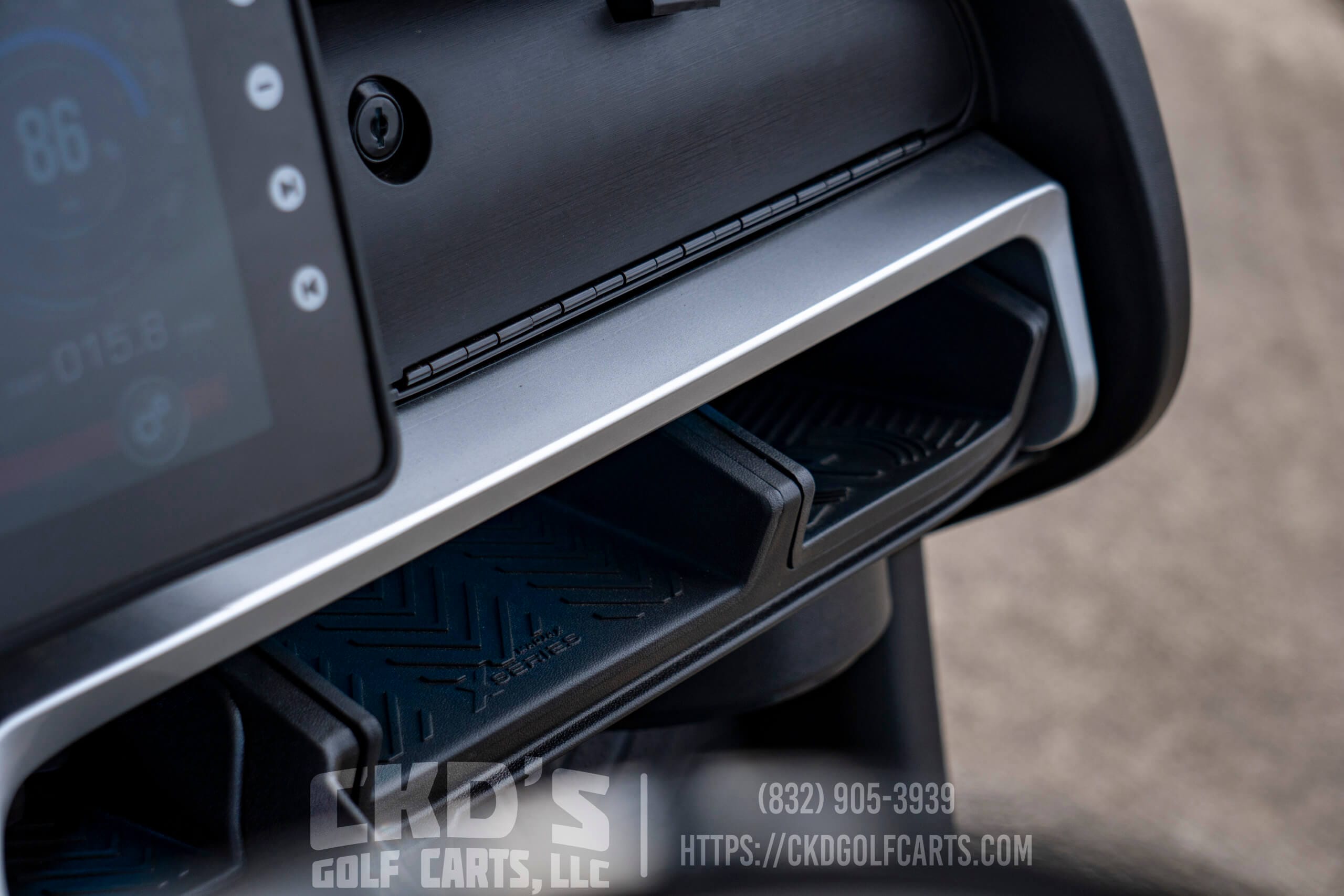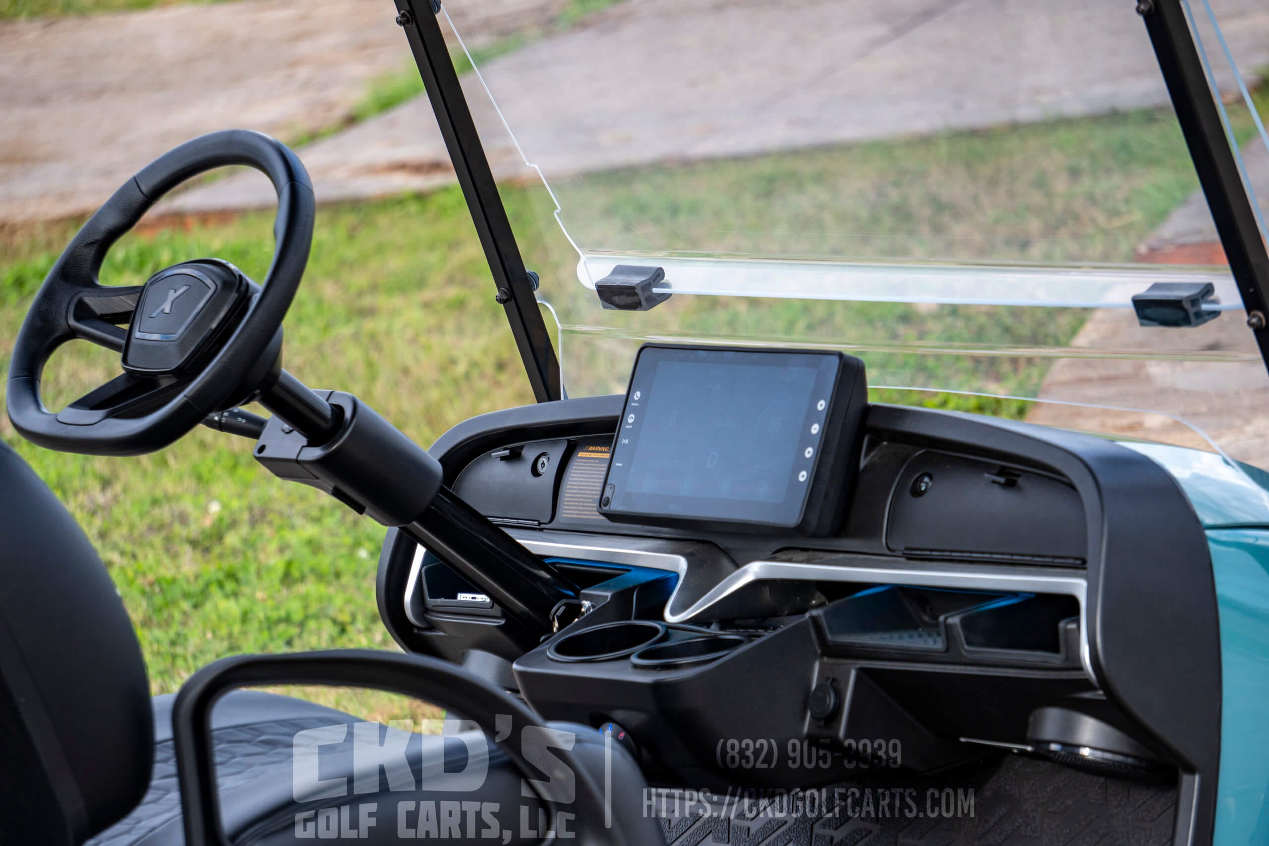 Additional features include a custom X-Series floor mat, a custom steering wheel, an overhead storage system, a built-in 30 amp converter to power 12-volt accessories, a 6″ Independent Suspension Lift Kit, a black 80″ long triple track top to cover all passengers, Heavy Duty Rear Suspension, a Concave rear view mirror, side view mirrors, high-speed mode, new black Premium Colorado seats for ultimate comfort, a new tinted folding windshield, a backup camera, and an SMV sign. This cart is the perfect setup for neighborhood cruising!
