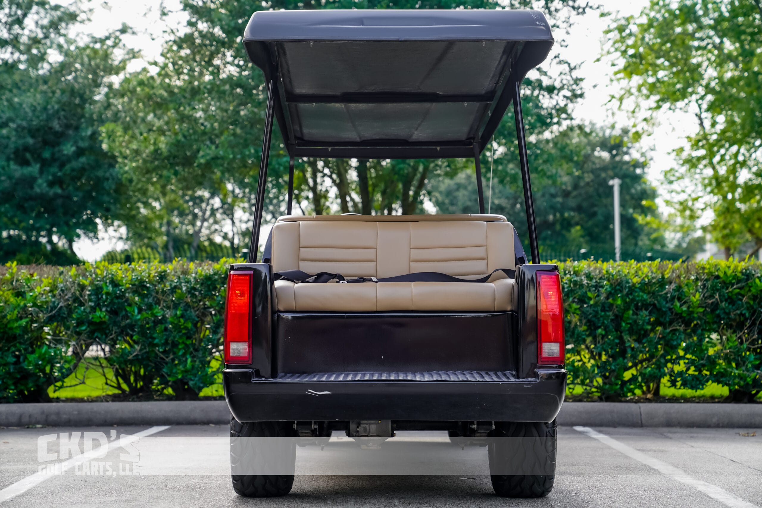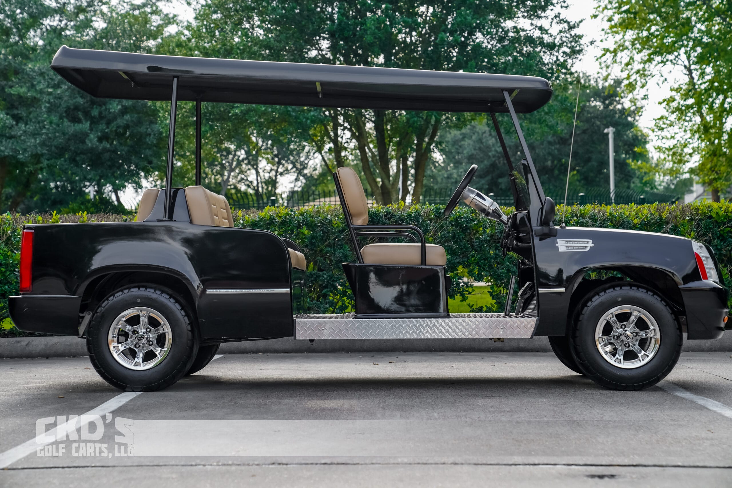 Selling on consignment a super nice Jet Black and Tan 2005 custom Cadillac Limo 6 passenger golf cart. This cart was custom built back in the day and spent it’s life in the garage in West Houston. The cart has new batteries and new tires and it looks and runs good! The cart goes 20 mph, has a basic stereo, windshield, extended top to cover all passengers, headlights and taillights and seat belts in it and looks just like an Escalade!