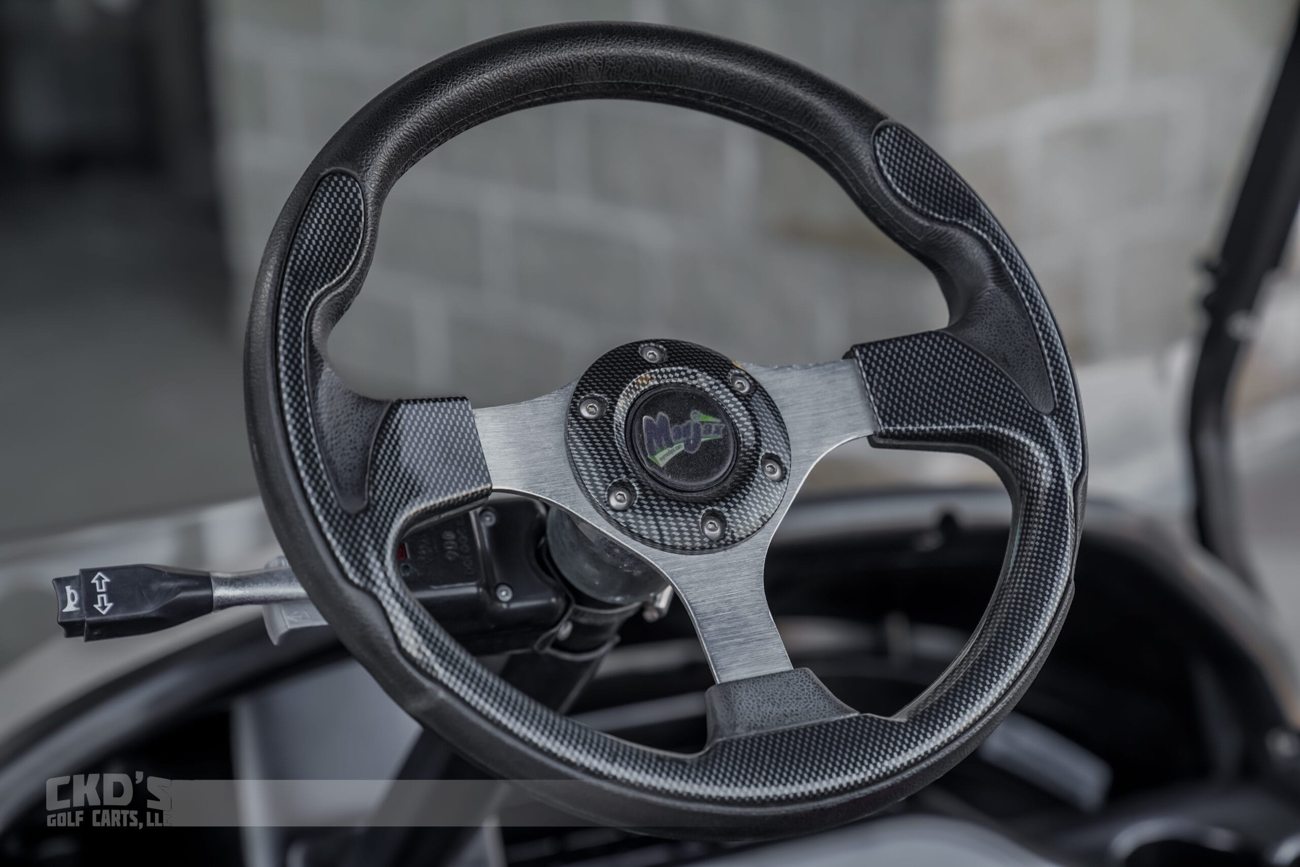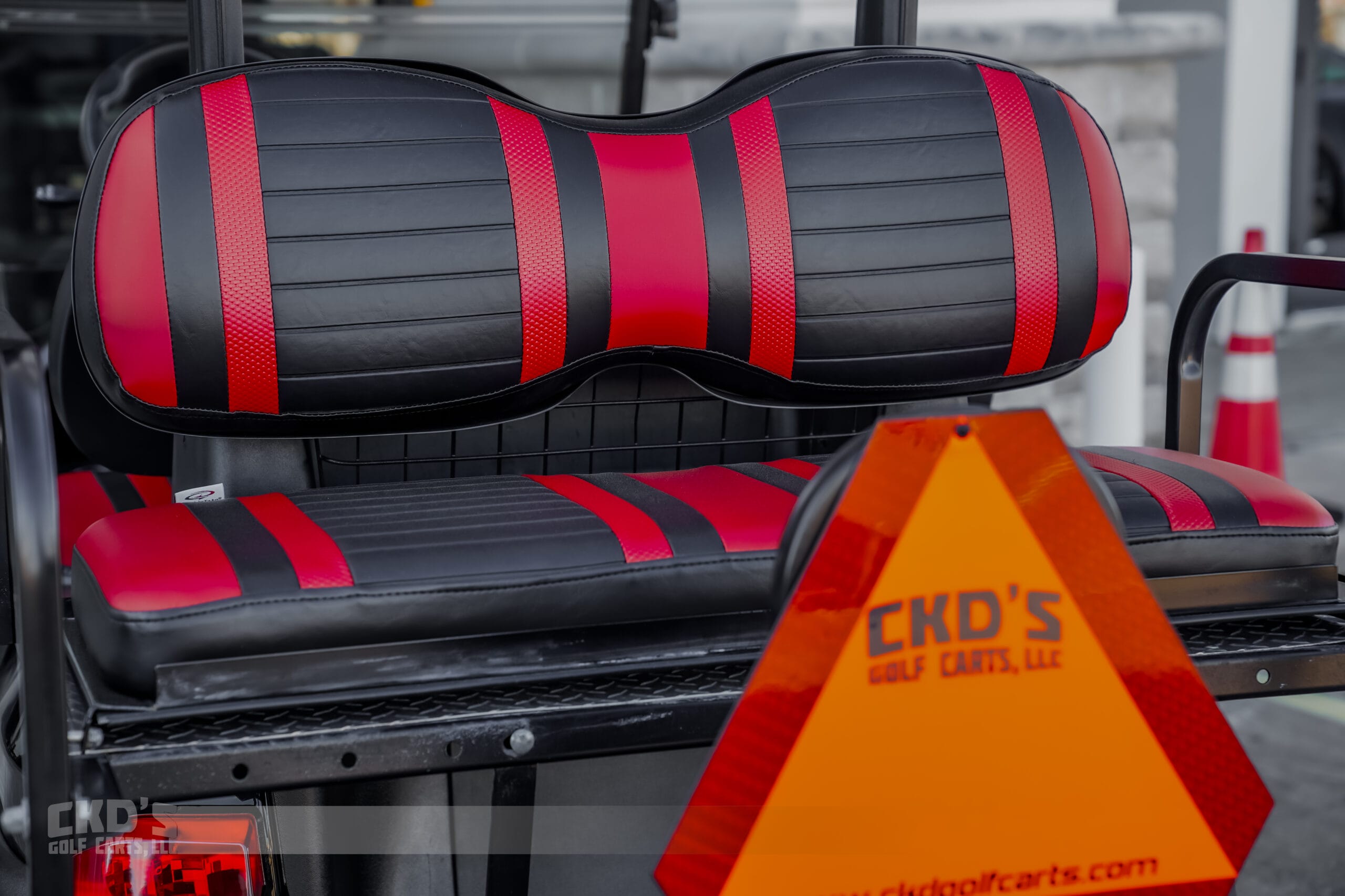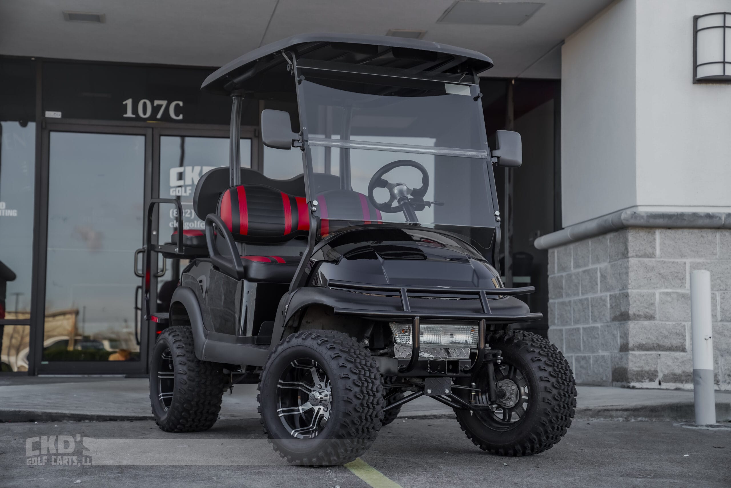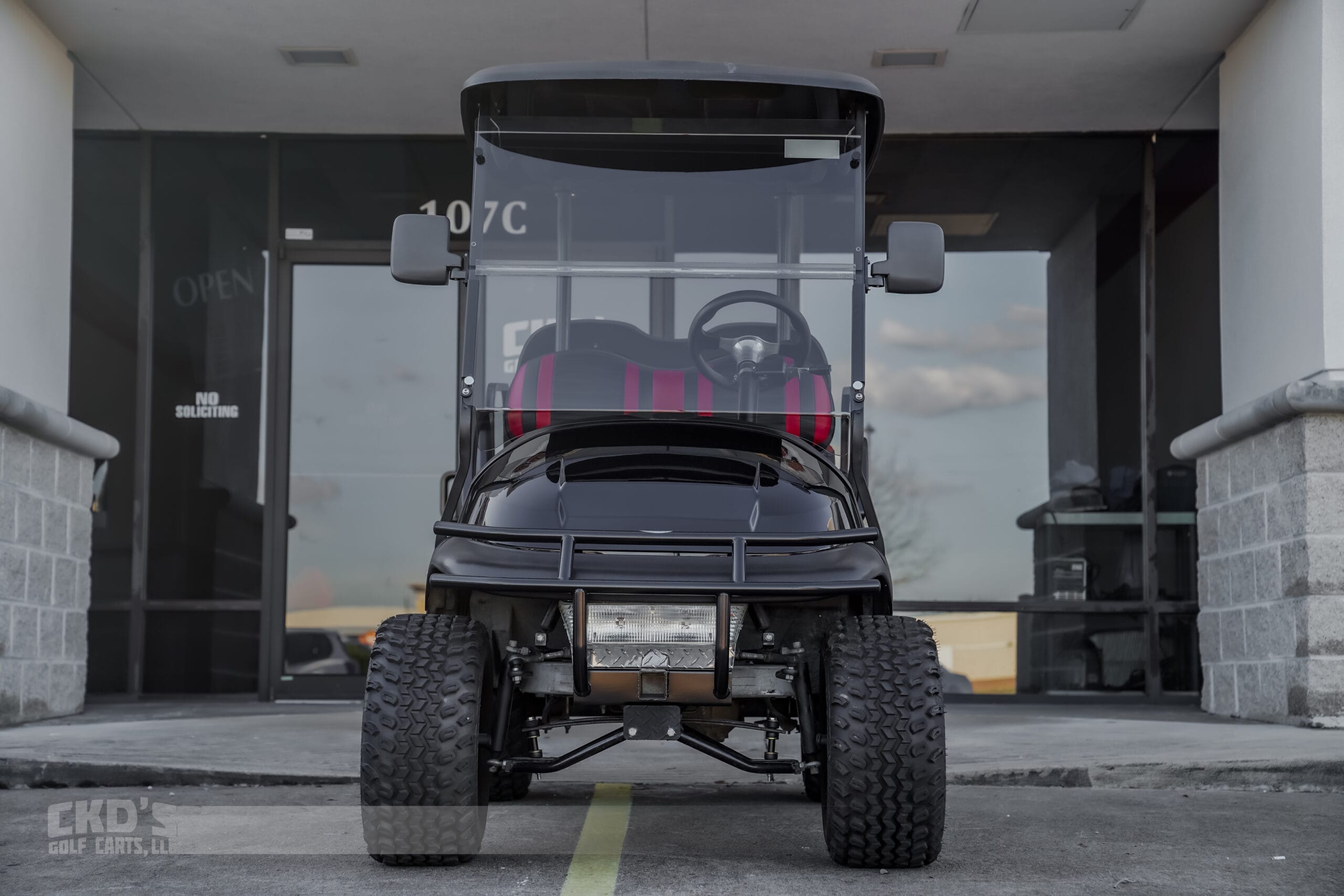 Selling on consignment a Black and Red 2008 Club Car Precedent 48 volt lifted golf cart with the following new items: New heavy duty rear leaf springs, new front and rear bushings, new black bodies, new brush guard with hitch, new Trojan 12 volt batteries, new battery cables, new black and red Extreme Striped seats and new windshield! It also has these existing accessories: rear flip seat with grab bar, 12″ black and machined wheels, side view mirrors, 5 panel mirror, factory charger and SMV sign. This cart is super clean and it looks great but we can add any or all of the following to it to further customize it for you: New Wetsounds or Memphis Bluetooth Soundbar, new 80″ black top to cover all passengers, up to 14″ wheels with 23″ tires, high torque/speed motor, front basket to hold a cooler, retractable seat belts or anything else you can think of! This cart is street legal as-is in many municipalities, and we can easily add other features as may be required for use on public roads in your area (regulations vary by locale.) For example, see TxDOT, Galveston Island and League City Golf Cart Ordinance requirements. CKD’s is your number one source for best value and selection in custom lifted gas and electric golf carts. We ship nationwide!