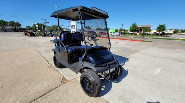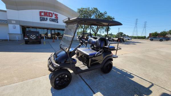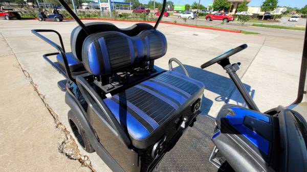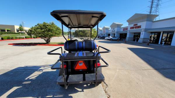 Selling on consignment a 2015 Club Car Precedent EFI Gas golf cart with the excellent running Subaru EFI gas fuel-injected engine. The cart has just been serviced and it has the following existing accessories: 4″ USA made A-Arm lift kit, heavy-duty rear leaf springs, 14″ wheels with low profile tires, USA made rear flip seat, black OEM style bodies, the USA made black powder-coated aluminum rear flip seat, black and blue extreme striped seats, 80″ blacktop with a built-in track for blue LED’S (currently installed but need to be replaced), blue underbody LED’S, new style Sentry dash with blue inserts, new Sony am/fm/cd/Bluetooth head unit with (4) Sony speakers, high-speed gears in the rear end, USA made black powder coated brush guard with hitch, ultimate led light kit (includes led headlights, taillights, brake lights, turn signals, emergency flashers, and a horn), 5-panel mirror and SMV sign. This cart is super nice, it looks good and it goes fast!