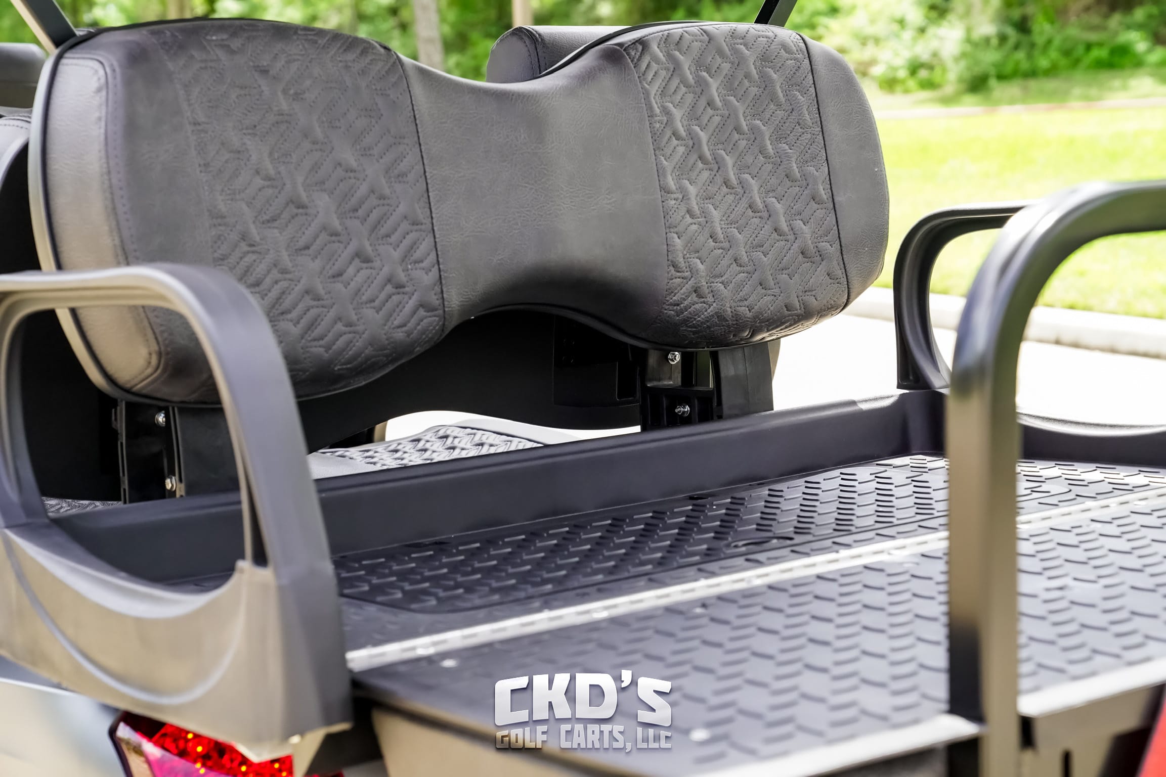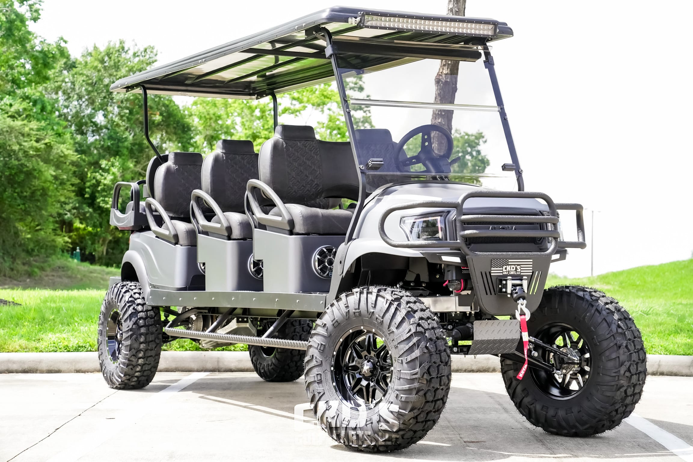 Custom-built 2022 Club Car Alpha 8-passenger stretched “Monster” EFI gas-powered ‘limo’ party wagon golf cart! We have custom-built this fine-looking machine using a like new 2022 Club Car Precedent golf cart with the Kohler 14 HP EFI gas engine and we’ve used the best of the best on this cart! The cart has had our fresh full reconditioning service and the engine has been serviced as well! The cart has an 8 seater “stretch” conversion and we have installed the following accessories: custom painted Matte Gray Alpha bodies and the proven 11″ heavy duty USA-made All Sports Long Travel lift (for the smoothest ride!) with Nitrogen front shocks, we’ve installed a GBoost High Torque Clutch and Drive Belt Kit, Heavy-duty rear leaf springs, MSA M26 Vibe 15″ wheels with huge 30″ EFX Motovator radial tires, custom black powder-coated drop-down style nerf bars with black diamond plate steps, custom Madjax Executive seats with head rests, custom front MadJax heavy-duty Alpha brush guard with Wireless 4500 pound winch. Color-matched seat pods with under-seat storage area, 140″ black extended top with built-in RGB LED accent lighting (change it to any color you’d like with an app on your phone.) USA-made unique Max 6 rear flip seat with stainless hardware, swivel cup-holders, step kit and black plastic (rust-free) footpan. New custom black diamond plate rubber style floor mat, Alpha Ultimate LED light kit (includes LED headlights, LED taillights and LED brake lights, turn signals, emergency flashers, daytime running lights and a horn.) Wetsounds MC2 Media Center, 600-watt Wet sounds system marine amplifier, (6) Wetsounds Revo 6 marine speakers with color-changing RGB LED light rings, (2) Wetsounds Revo 8″ speakers with RGB light rings and trunk-mounted 10″ powered Wetsounds subwoofer. This stereo system cranks really loud and sounds awesome!