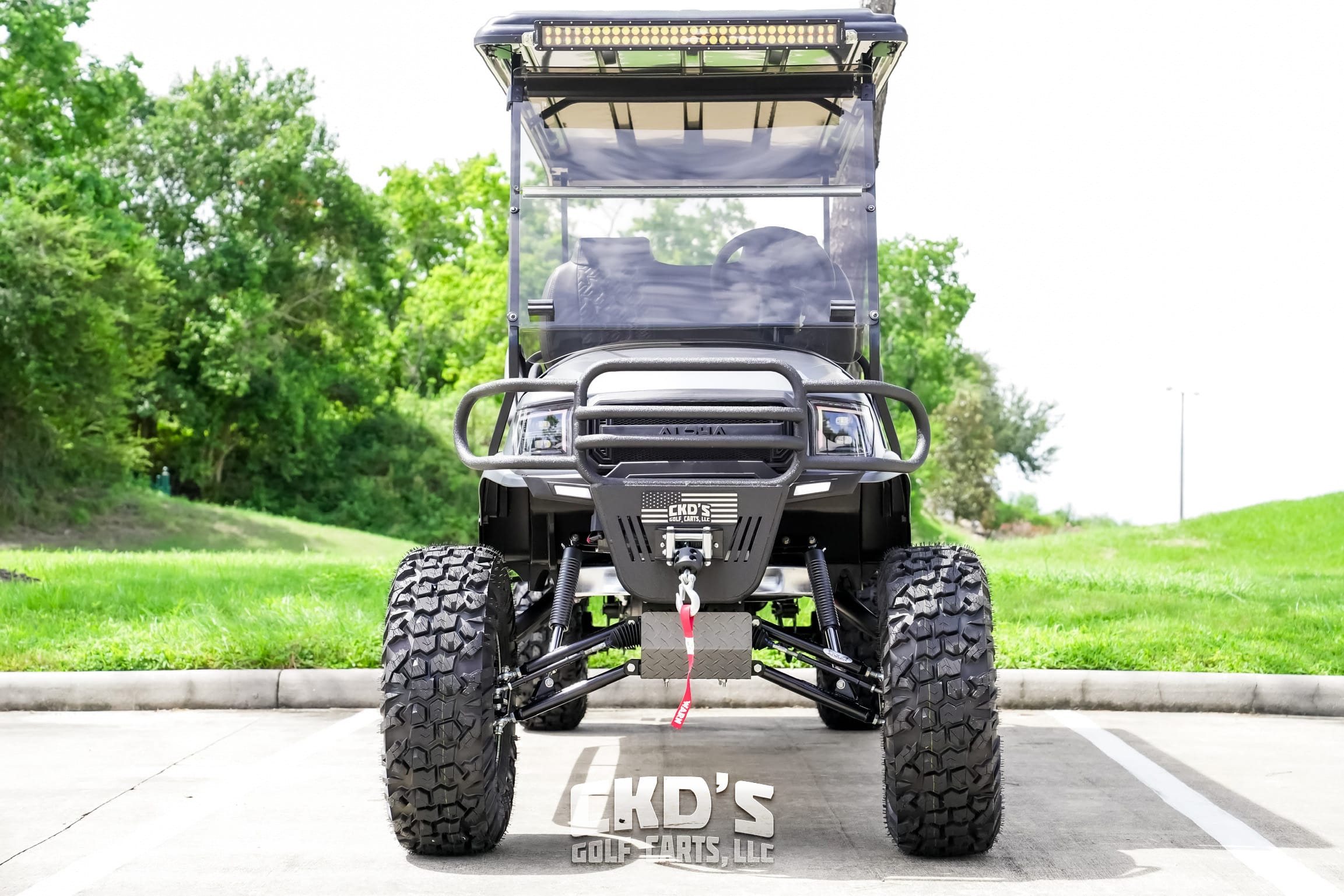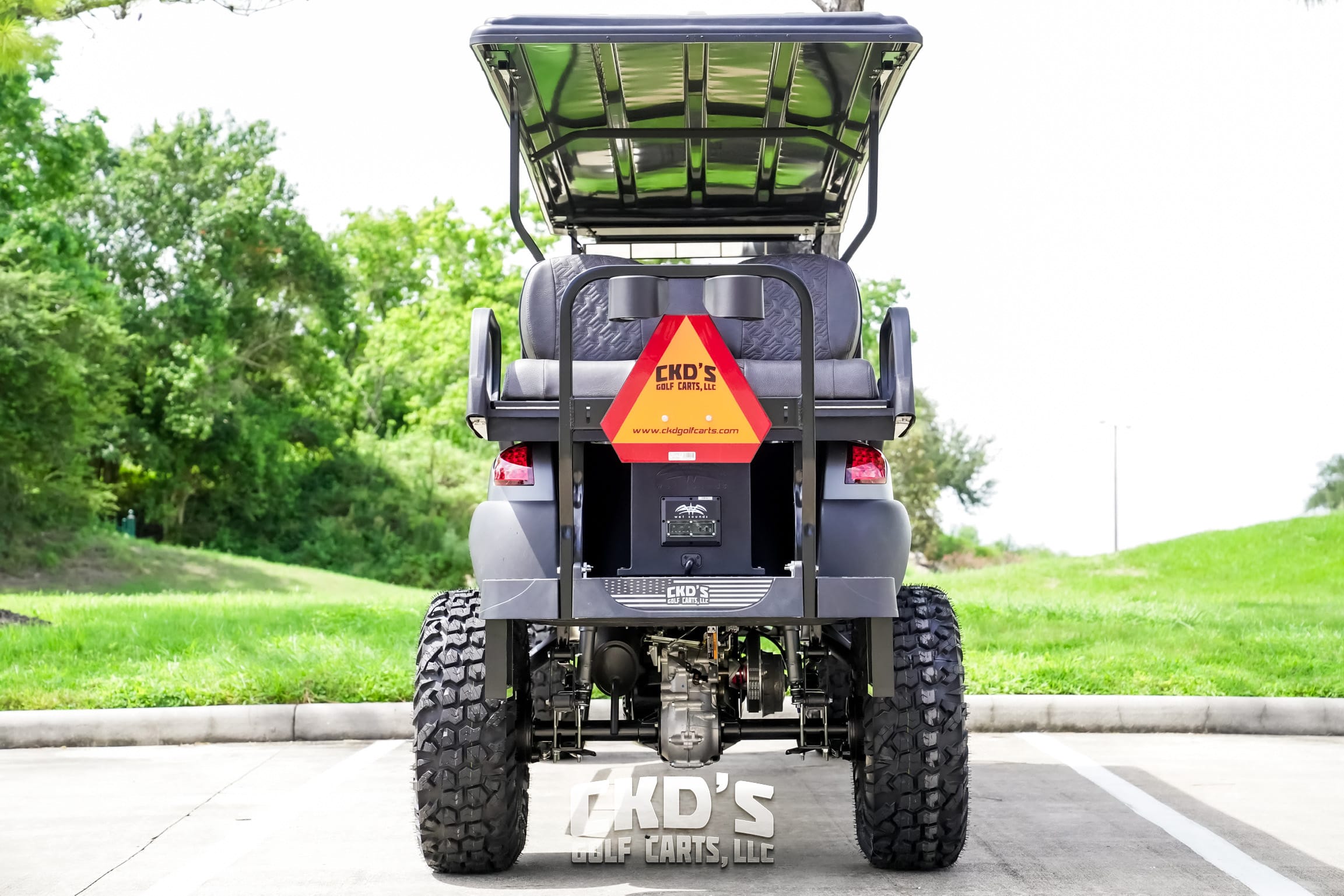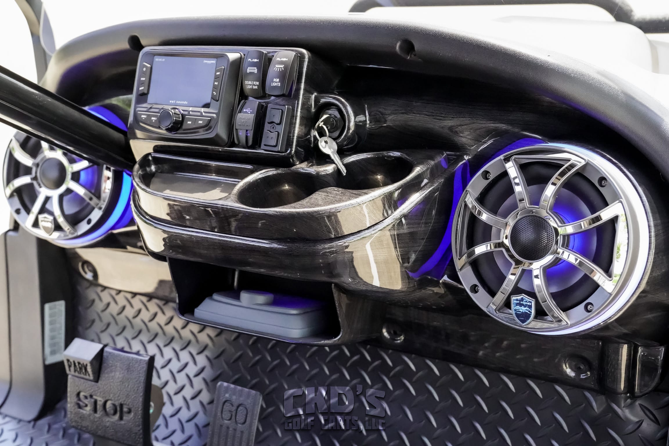 New style Sentry dash with Wetsounds MC2, dual USB charging ports, accessory switches for the LED light bars and the RGB lights, wireless garage door opener, fuel gauge/hour meter and uncommon key (so no one steals your ride!). Custom black steering wheel and hub adapter, RGB LED underbody accent lights, 30″ dual row RGB back-lit LED light bar front-mounted on the roof, tinted folding “magnetic latch” windshield, overhead 5-panel mirror, (2) large maintenance-free Optima AGM batteries, (one is used to start the cart and the other to power all of the 12-volt accessories) and slow-moving vehicle (SMV) sign (not shown but will be installed). This cart is sweet!